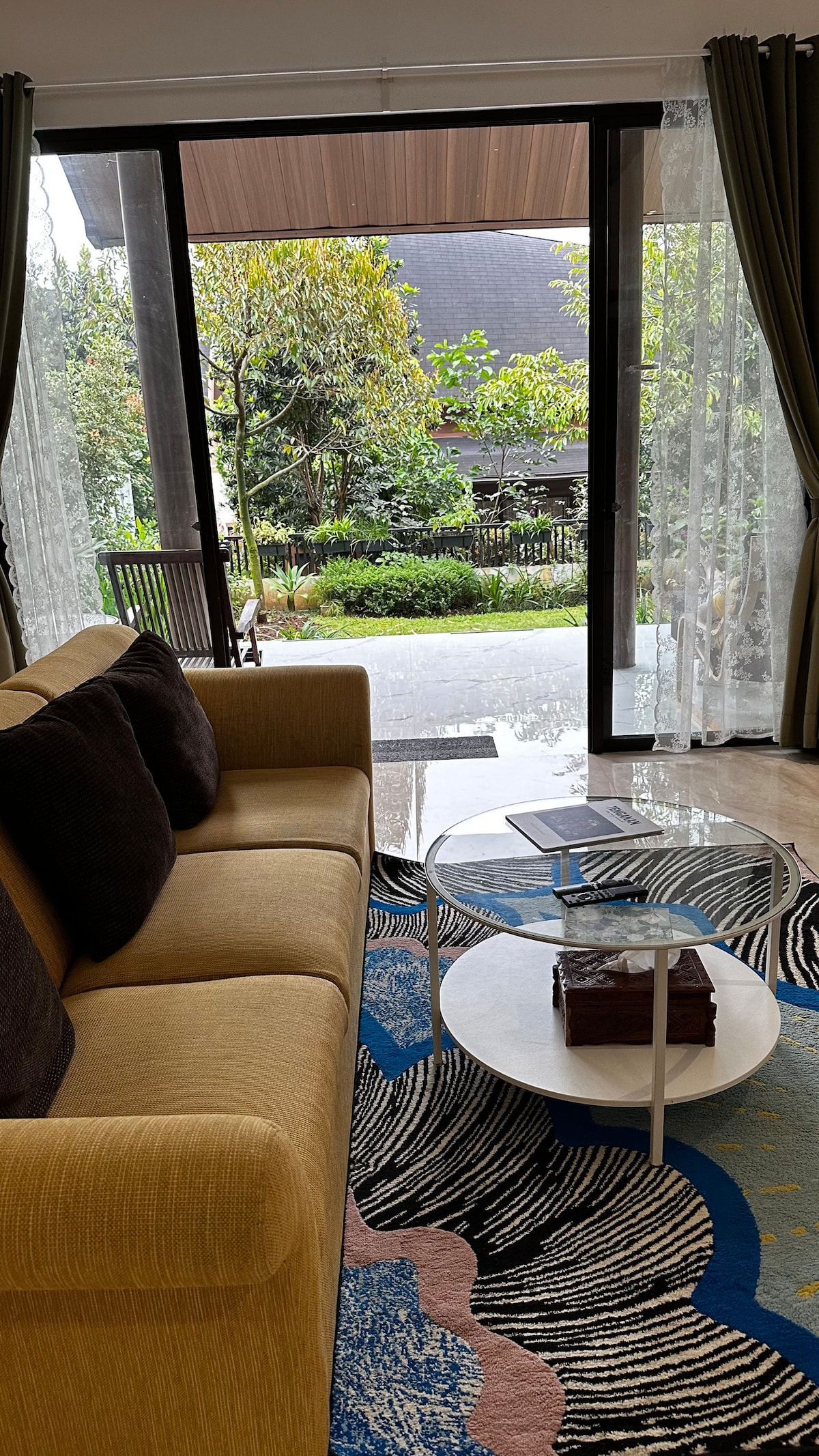 This two-story house in Kertamaya, Bogor offers comfortable accommodation with three queen-sized bedrooms (one located on the ground floor, and two upstairs). Includes 2.5 bathrooms and a semi-outdoor kitchen. Guests can enjoy a private swimming pool. There are two living rooms on each floor, with a Google TV available in the upstairs living area and the downstairs bedroom. Amenities include a private garage with parking for up to two cars, EV charger, and a rooftop area with seating.