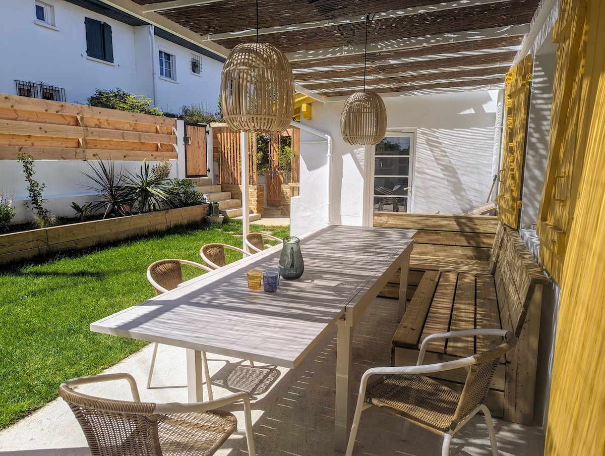 In the heart of the city, close to the beaches and shops but quiet, you will immediately feel on vacation in this charming house decorated with taste. Its private garden with deck chairs and garden furniture will be ideal for your rest and your various meals. It has on the 1st floor 2 bedrooms and a bathroom. To work you have a very fast connection. This house is perfect for spending a pleasant holiday with family or friends...