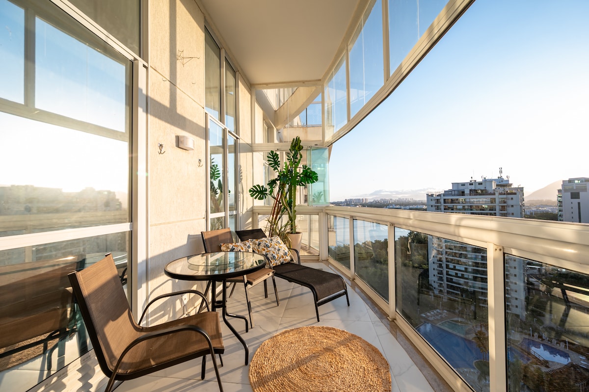Lugar delicioso com muito verde, varanda com vista, rede e sol da manhã, sala integrada (sofá-cama, TV, split), quarto com cama queen, closet e cofre. Piscina aquecida, restaurante e estacionamento no prédio. 📍 Localização perfeita: região tranquila, perto de mercados, shoppings e praias da Barra. Fácil acesso de carro, metrô, BRT, uber, barco-táxi ou bike! Descubra porque Tim Maia eternizou que 🎶 “Do Leme ao Pontal não há nada igual!”.