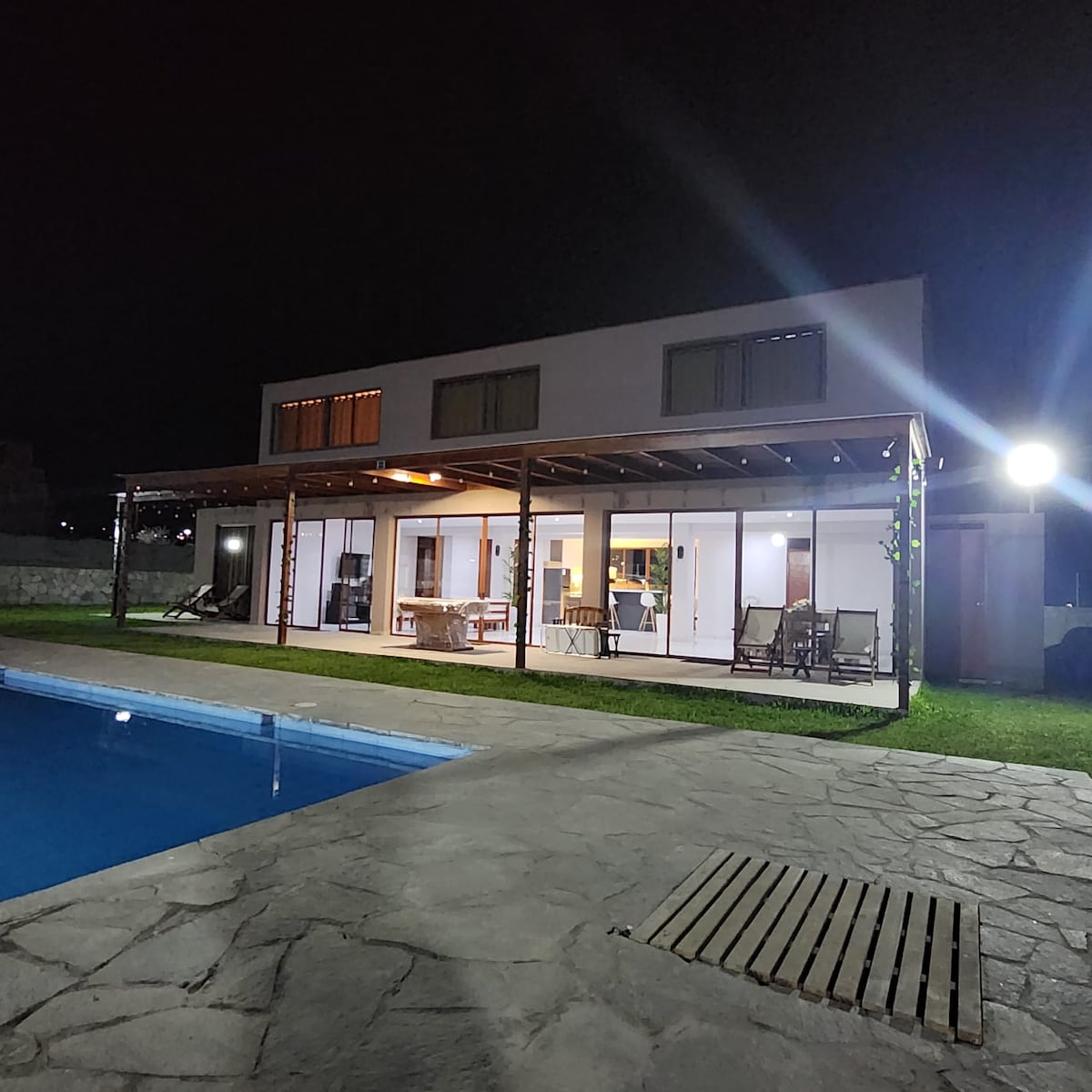 Casa de campo ideal para familias y grupos que buscan disfrutar juntos con total privacidad. Cuenta con un amplio jardín privado, perfecto para que los niños jueguen con seguridad mientras los adultos descansan y comparten. Disfruta de la piscina, parrilladas en familia y noches agradables alrededor de la fogata, en un ambiente tranquilo y cómodo. La casa ofrece: 🌿 Jardín privado 💦 Piscina 🔥 Fogata 🍖 Parrilla y caja china 🍽 Cocina equipada 📺 TV 🌐 Wifi 🚗 Estacionamiento privado