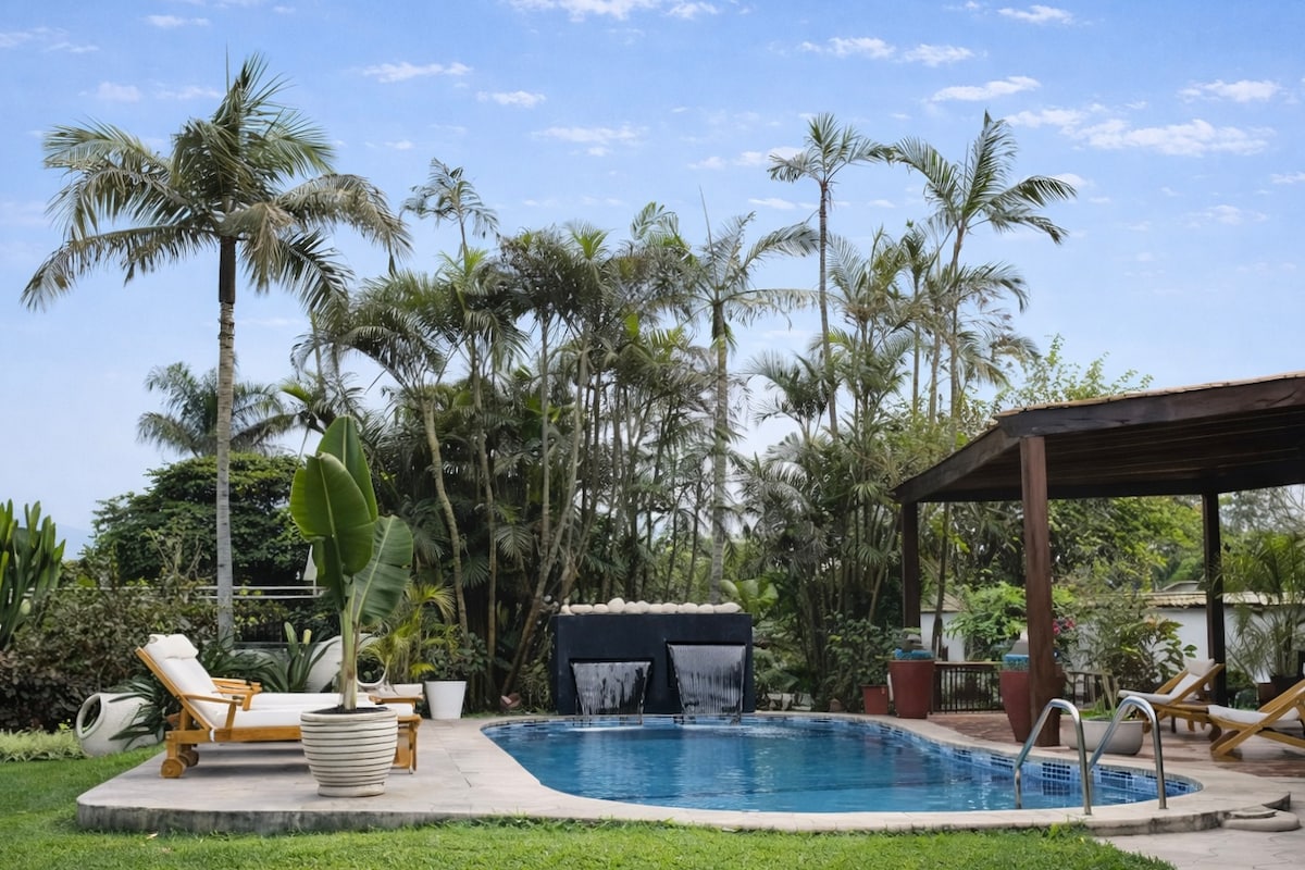La casa está rodeada de jardines, es amplia, comoda tiene iluminación natural por los amplios ventanales los 3 dormitorios la sala y la terraza tienen una vista preciosa a la piscina, la cocina y sala de estar tiene vista al jardín posterior donde se encuentra la zona parrillera. La decoración y muebles es de tipo rústico.