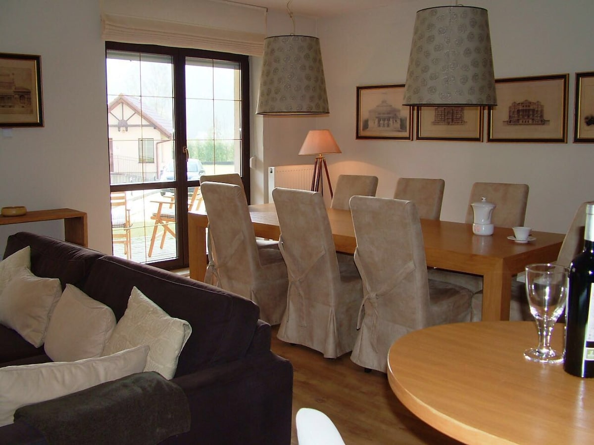 Apartament położony jest w miejscowości Szczyrk i oferuje nocleg dla 9 osób. Jest dwupoziomowy, w dolnej części znajduje się przestronny salon z aneksem kuchennym, w pełni wyposażonym, dostępne są 3 sypialnie, łóżka wraz z pościelą oraz komody do przechowywania ubrań. Dostępne są 2 łazienki, jedna z sauną, w obu jest prysznic i toaleta. W salonie jest kominek, TV i stół jadalniany z krzesłami. Cały apartament jest klimatyzowany. W garażu dostępna jest narciarnia. Zakaz organizowania imprez.