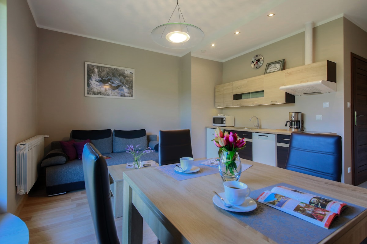 To przestronny apartament o powierzchni 60m2, który pomieści od 4 do 6 osób. Z jego tarasu rozciąga się wspaniały widok na góry. Jest to jeden z dziewięciu apartamentów w tej lokalizacji, który wyróżnia się połączeniem drewna z elementami góralskiego folkloru. Znajduje się z dala od ulicznego zgiełku, jest więc idealnym miejscem wypoczynku dla tych, którzy cenią sobie ciszę oraz spokój. Latem na tarasie znajdują się meble ogrodowe.