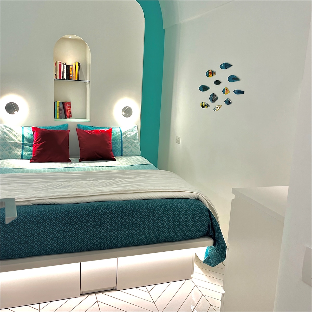 Bilocale di 45m2 situato al primo piano con accesso indipendente da terrazzo esterno privato di 20mq arredato, con vasca idromassaggio ad uso esclusivo e vista mare. E’ dotato di camera da letto matrimoniale con balcone, armadio, bagno privato con doccia, area living con angolo cottura, tavolo, sedie e 2 divani matrimoniali. Tutte le attrezzature per cucinare sono a disposizione degli ospiti. È dotato di tutti i confort: aria condizionata, Wi-Fi, tende oscuranti, Smart tv, asciugacapelli.