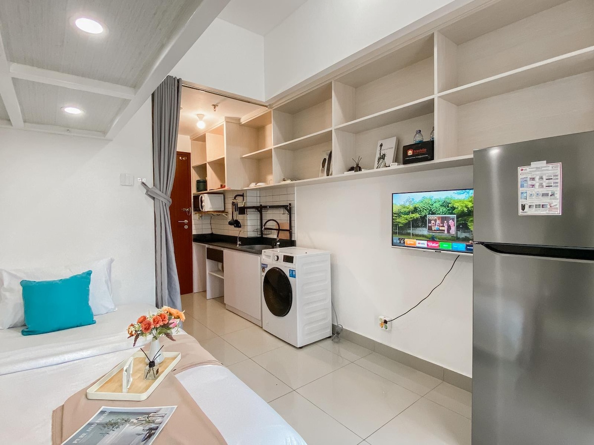 An elegant 24sqm studio in Jakarta's center, blending style and convenience. Includes kitchen, fast Wi-Fi, air-purification, 43" smart TV, sound system and Netflix. It is ideal for various stay types, with contactless access and amenities like pools, jacuzzi, gym, and basketball, Now features a Reverse Osmosis dispenser & food waste disposal, The picture shows a gas stove that has been replaced by an induction cooker (to follow the apartment guidelines for fire hazards)