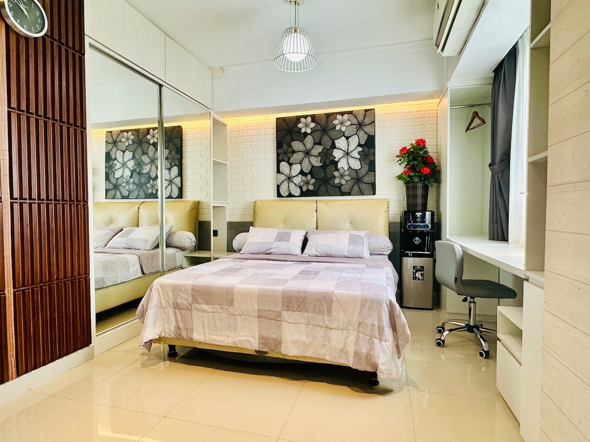 Nearby to JIEXPO and JIS, our studio at Maplepark apartment offers modern comfort, high-speed internet & Netflix. The open-plan layout features sleek furnishings, abundant natural light, and seamless working, & sleeping areas. The well-equipped kitchenette and plush sleeping area ensure comfort and practicality. With easy access to your events and a private balcony offering pool views, this studio combines urban sophistication with cozy charm, making it the perfect home in the heart of Jakarta.