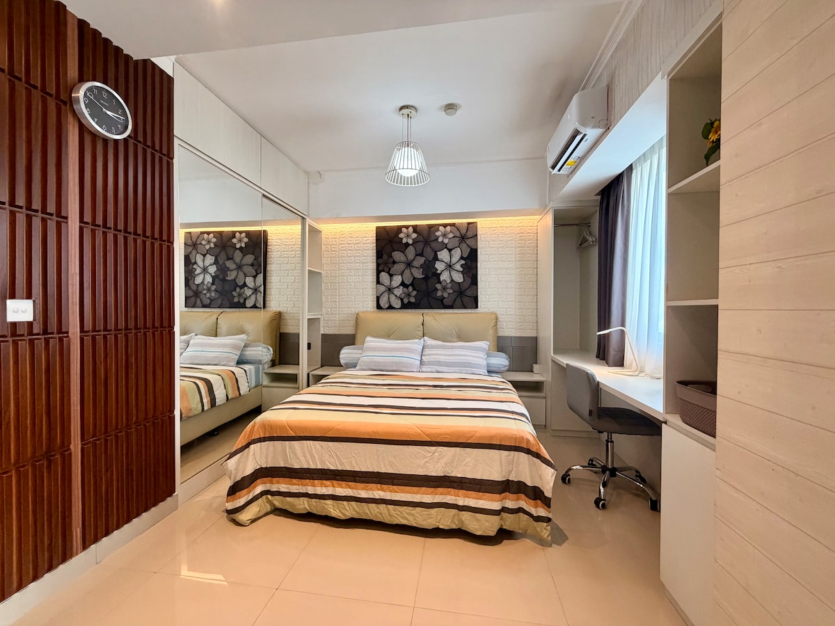 Nearby to JIEXPO and JIS, our studio at Maplepark apartment offers modern comfort, high-speed internet & Netflix. The open-plan layout features sleek furnishings, abundant natural light, and seamless working, & sleeping areas. The well-equipped kitchenette and plush sleeping area ensure comfort and practicality. With easy access to your events and a private balcony offering pool views, this studio combines urban sophistication with cozy charm, making it the perfect home in the heart of Jakarta.