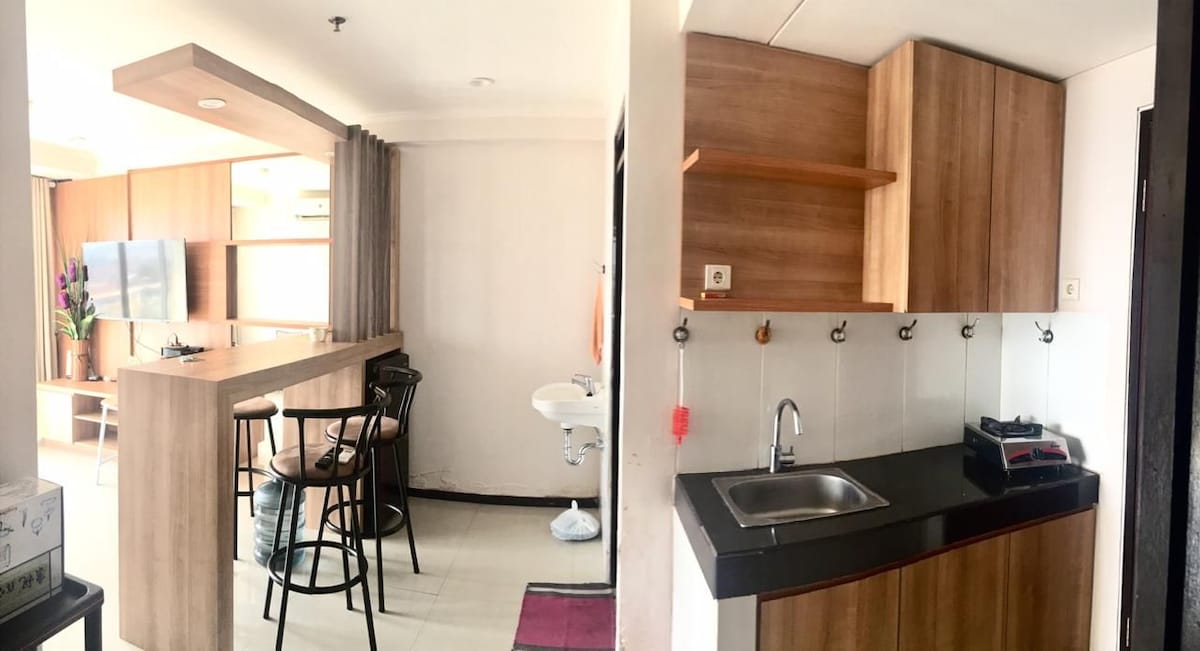 Super cozy and clean apartment with 2 rooms, with a bit coast ambience, and good views. Strategically located because it is next to the Pasteur Toll gate, one of main road in Bandung. There is one queen size bed, 1 up and down bed, and 1 sofa bed (capacity for 6 people) We have complete amenities like: Smart TV, Unlimited Wifi, Air Conditioning, Water heater, electric stove, microwave, Gallon water to drink, mini kitchen, hair dryer, iron table, towel (4 towel) and more