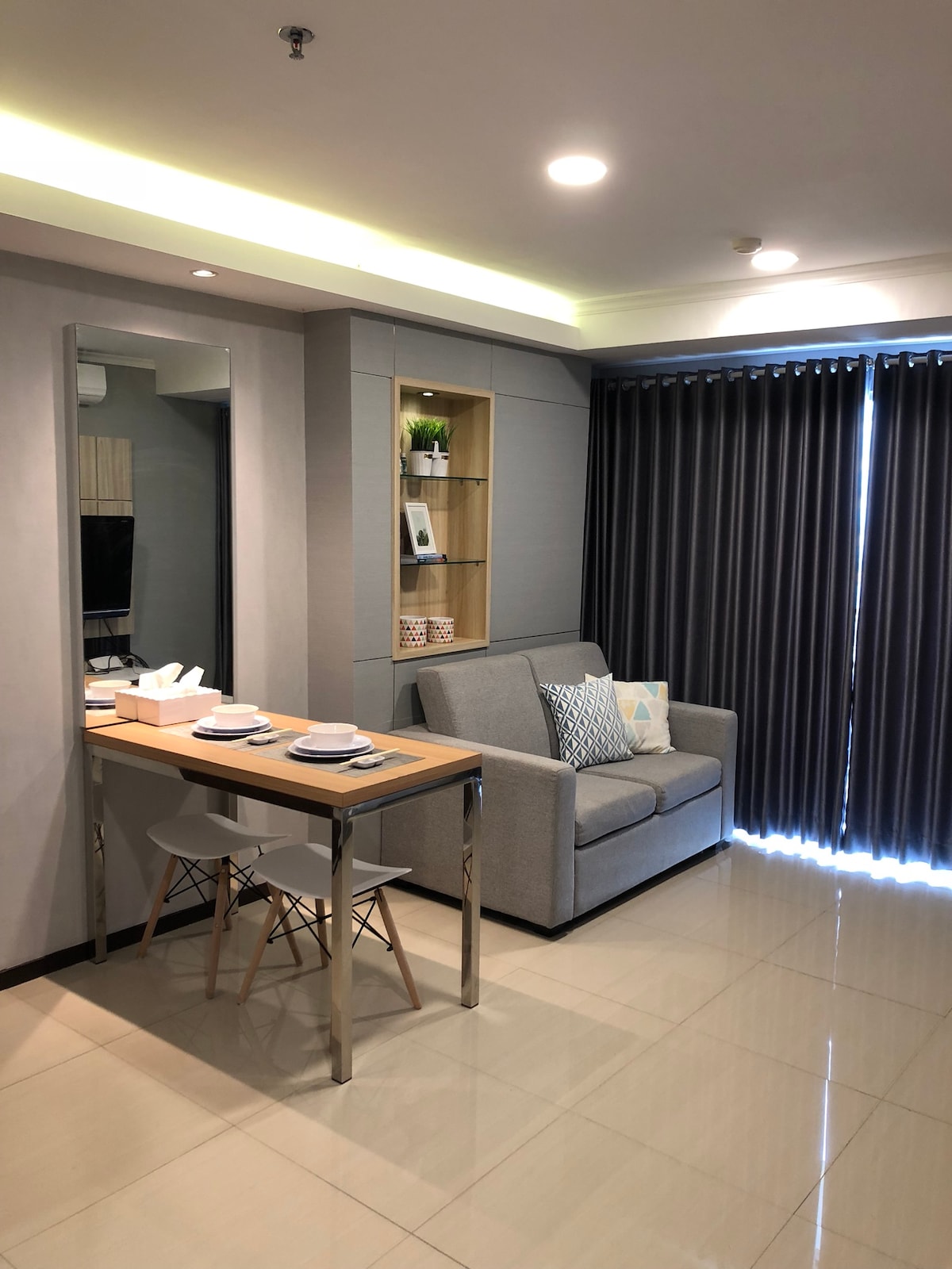 Welcome to Château — unit apartemen bergaya French Classic yang anggun ala Eropa. Mood: 🕯️🪞🧐🌤️📸 Unit 2 kamar ini cocok untuk sampai 5 tamu. Dengan sentuhan warna putih & abu yang elegan, panel dinding ala Parisian, dan balkon dengan pemandangan gunung. Unit ini ideal bagi keluarga atau teman yang mencari pengalaman menginap aesthethic di Bandung. Berlokasi di Gateway Pasteur, dengan akses mudah ke PVJ, Paskal, Dago, Riau, Gedung Sate, dan gerbang tol.