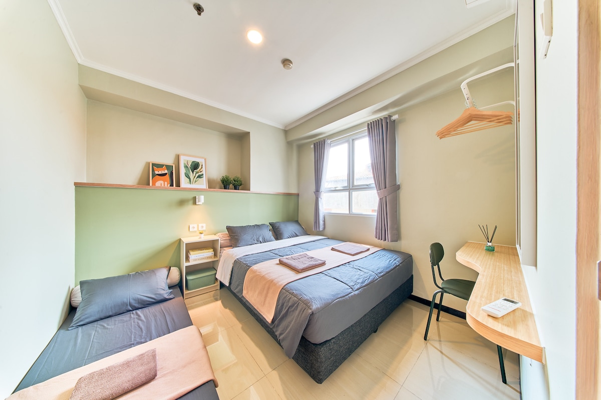 Super cozy and clean apartment with 2 rooms, with a bit coast ambience, and good views. Strategically located because it is next to the Pasteur Toll gate, one of main road in Bandung. There is one queen size bed, 1 up and down bed, and 1 sofa bed (capacity for 6 people) We have complete amenities like: Smart TV, Unlimited Wifi, Air Conditioning, Water heater, electric stove, microwave, Gallon water to drink, mini kitchen, hair dryer, iron table, towel (4 towel) and more