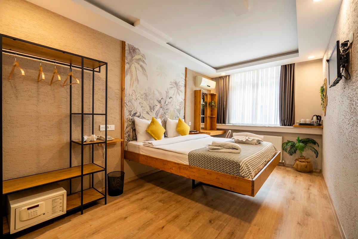 Butik otelimizin ferah, geniş, iki kişilik studio odasında rahat ve konforlu bir şekilde konaklayabilirsiniz. Odamızda çift kişilik yatak bulunuyor. Akıllı Tv ve klimalıdır. WiFi hizmetimiz bulunmaktadır. 7/24 resepsiyon hizmetinizdedir. Butik otelimiz harika bir konuma sahip olmakla birlikte, gençlerin uğrak mekanı olan kafeler sokağındadır.