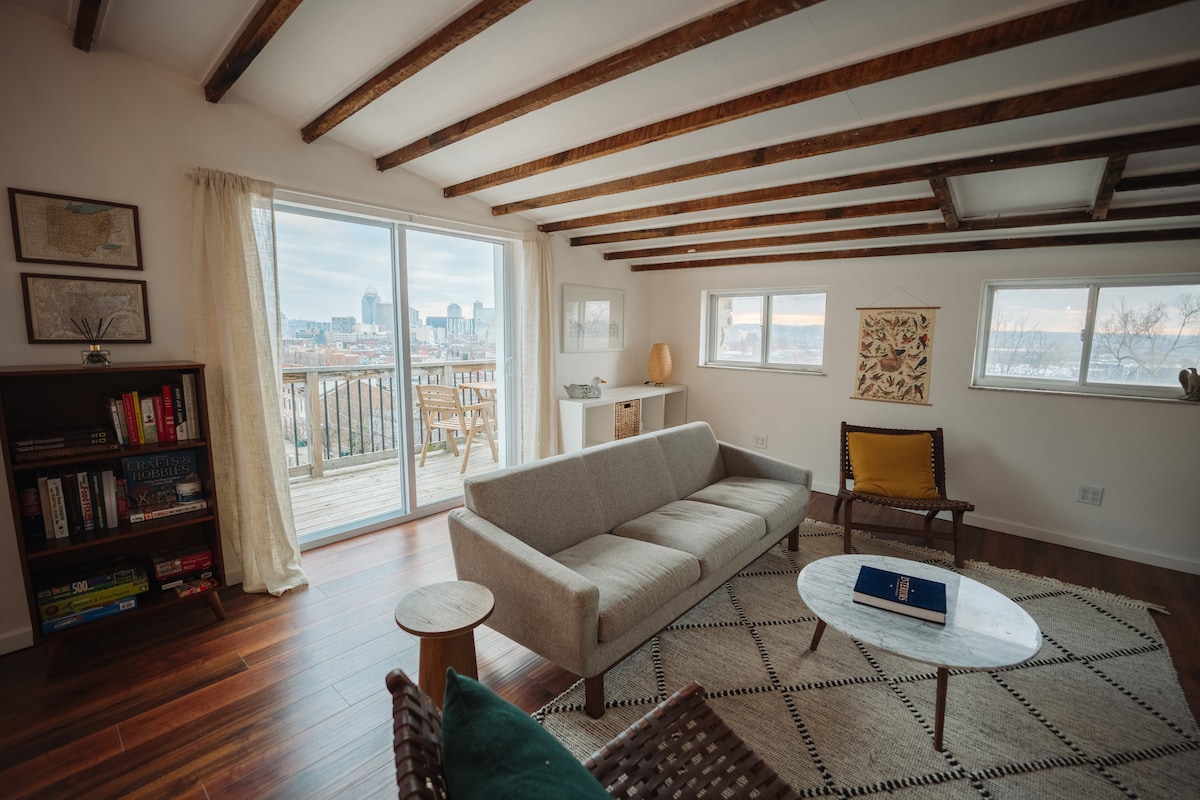 Spectacular View of Cincinnati in Boutique-Hotel style Full Home designed by Award-Winning Designer. • No downtown Airbnb has this much • On Quiet/Safe Street • Central Location • Security camera at entrance • Programmed lock changed after each guest. • One of "The 7 Coolest AirBnBs in Cincinnati" by Cincy Refined • Walk/Bike/Scooter to Downtown/Dining/Shopping, Nightlife, UC, & Reds/Bengals • 20 minutes to Airport • Quick access to I-71 & I-75 • Incredible Private Indoor & Outdoor Spaces