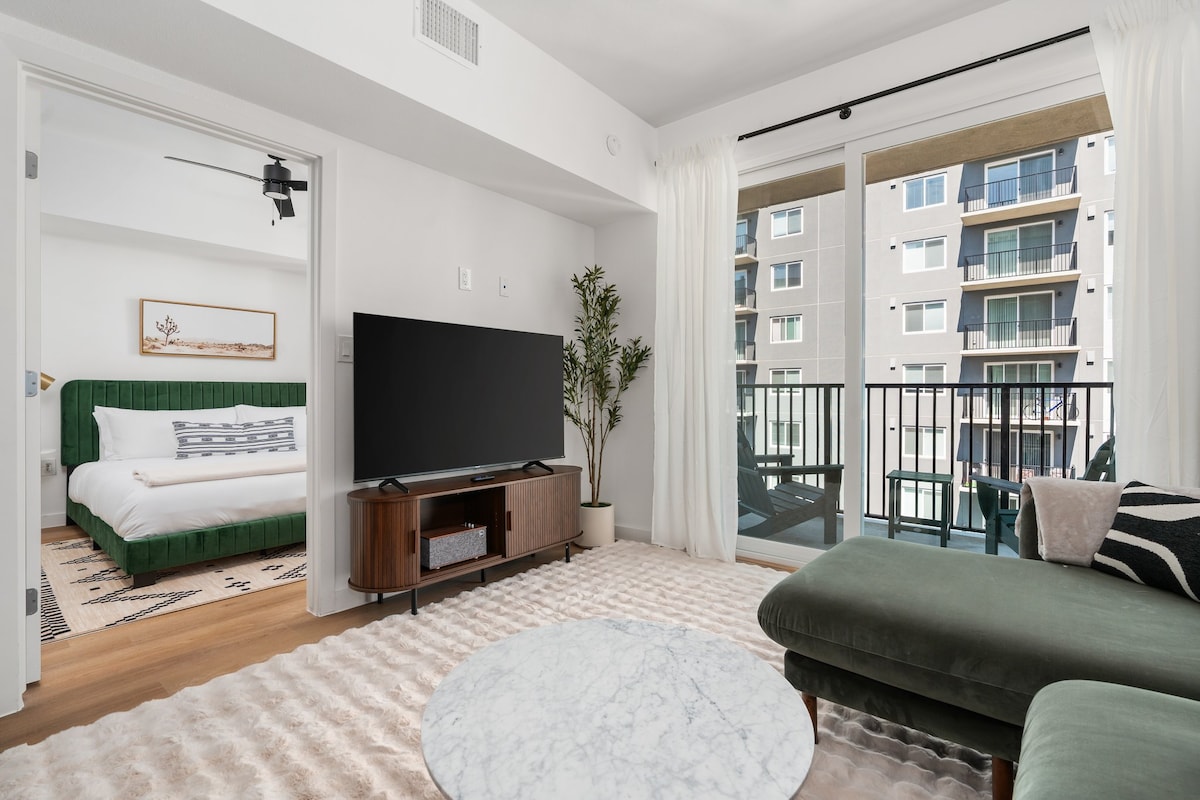 Experience staying in this one-bedroom apartment featuring a comfortable queen bed with a memory foam mattress and a queen sofa bed. Enjoy the convenience of a smart TV in both the bedroom and living room, as well as high-speed internet for remote work. You'll also have access to the pool and gym in a peaceful and upscale neighborhood. The kitchen comes fully stocked with all the amenities you need to make it feel like home.