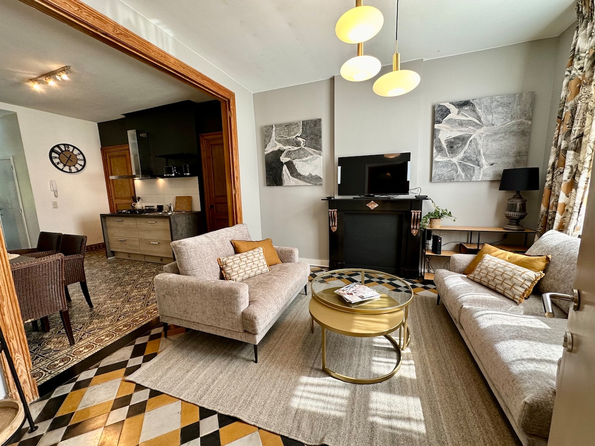Charmant appartement rénové en 2019, se composant de deux chambres à coucher, avec lits 2 personnes et d'une cuisine entièrement équipée. Il est pourvu de tous les équipements nécessaires pour se sentir comme chez soi (draps de lit et vaisselle fournis (Pas les serviettes de bain)- condiments de base pour cuisine, thé et café gratuits...) Wifi Parkings aisés et gratuits devant la maison
