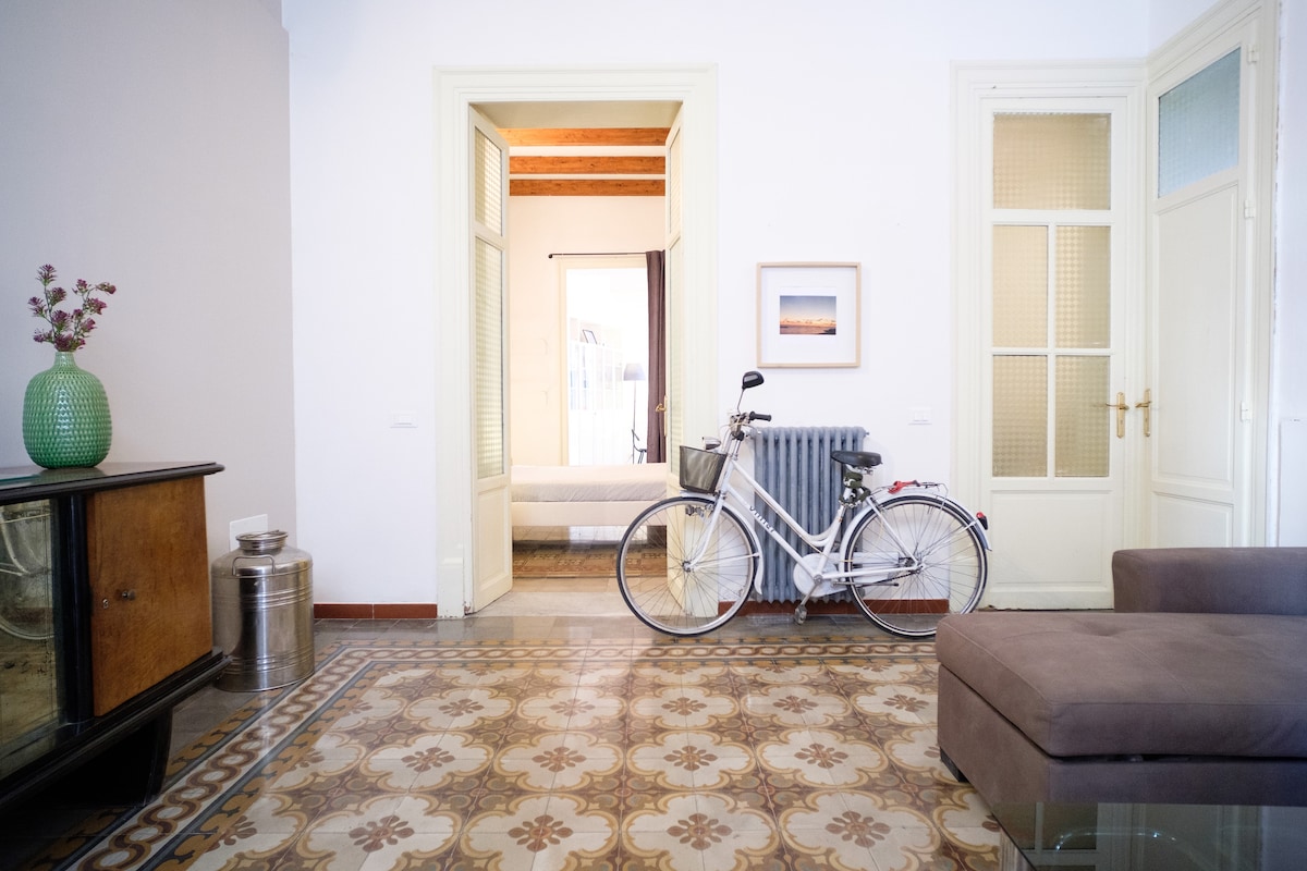Early 1900s apartment in an elegant renovated setting with all Art Nouveau elements preserved. Frescoes and floor decorations create a unique blend with the new furniture. Featuring 2 double bedrooms and a spacious living room with a sofa. Large kitchen and bathroom. Three PC monitors, dryer, and washing machine, heating, and WIFI. Located just a few meters from Via Dante, Villa Malfitano, and Palazzo Florio. The city center (Piazza Castelnuovo) is only a 12-minute walk away (1100 meters) (Maps)