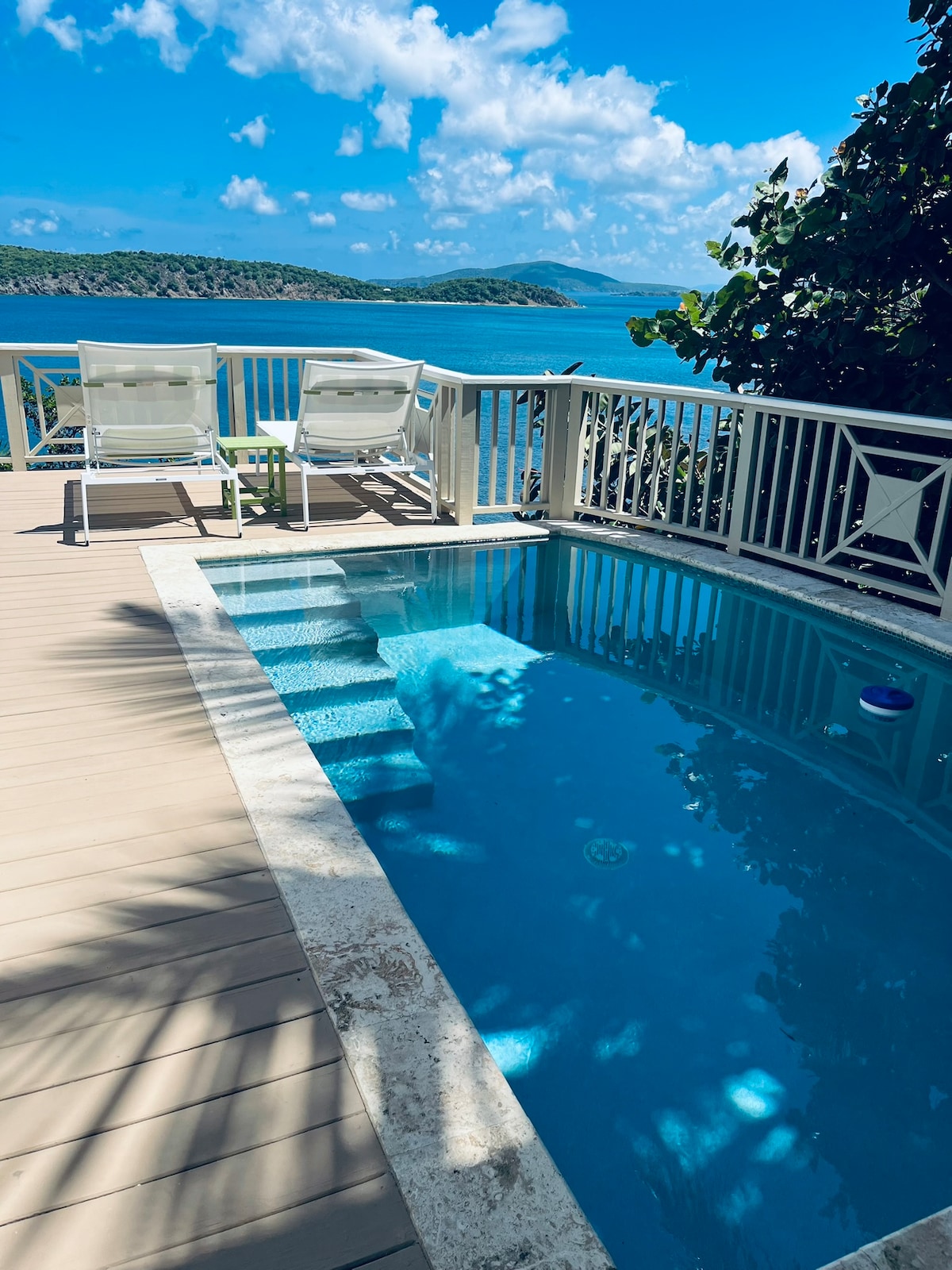2 cozy bedrooms, fully equipped kitchen, large decks, pool, solar and backup battery power. Everything you need for a day at the beach: chairs, umbrella, coolers, toys, towels all provided. Close to Coral Bay restaurants and shops. North Shore beaches and hiking trails are only a short drive away. Quiet setting in the hills above Coral Bay. Close to it all with a far away feel. good for couples, solo adventurers, and families with children over the age of 8.