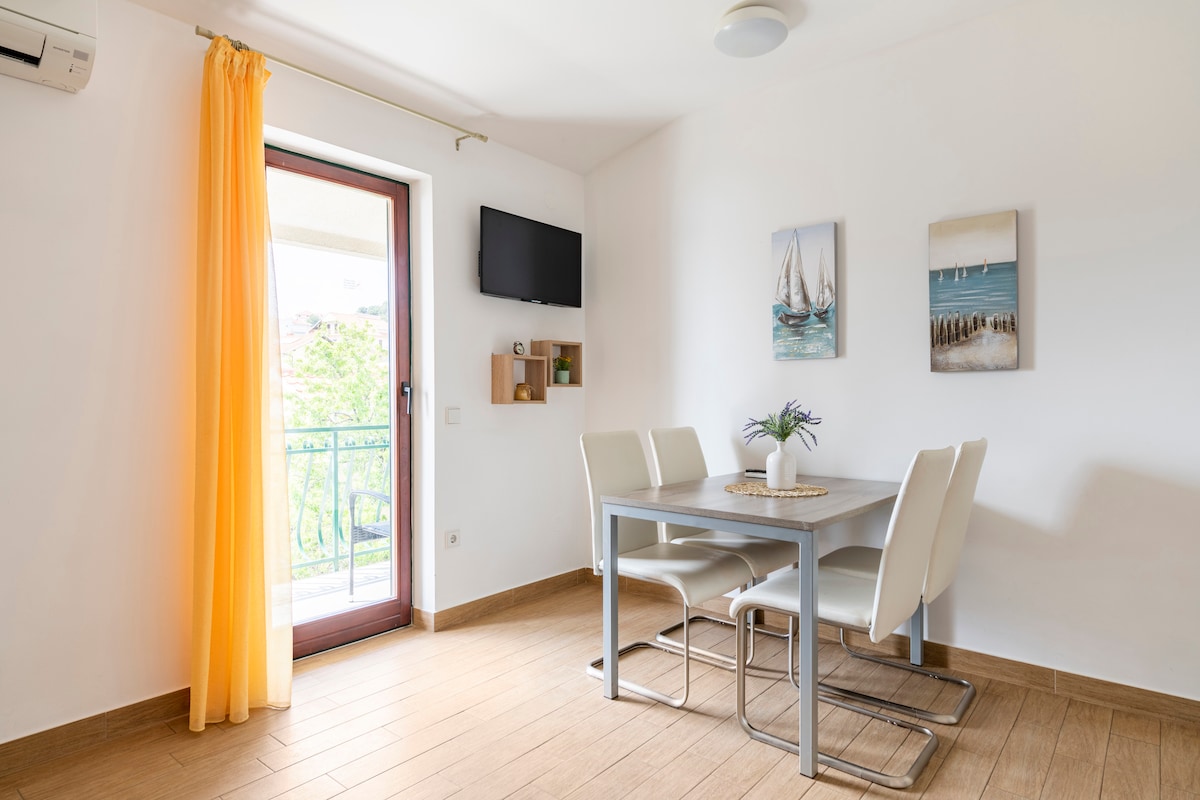 Cozy studio with a stunning sea view. Located by the beach, just 2 km from Trogir, this small but fully equipped studio is a great base for your vacation in central Dalmatia. A beautiful pebble beach is right across the street — just a few steps away. The terrace is shared between two studios, with a designated area in front of each for private use. Please note that during peak season, street parking can be difficult to find, even further from the house.