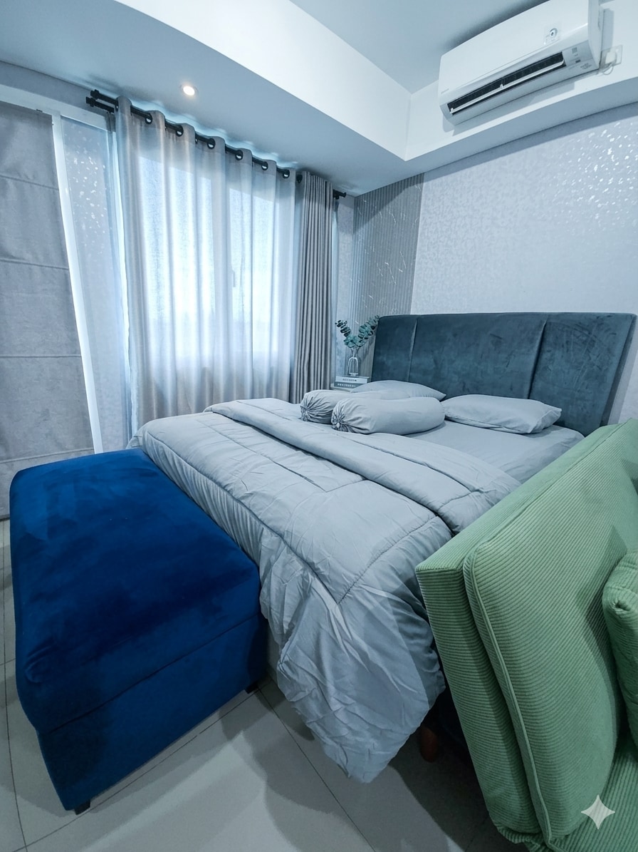 Apartemen yang nyaman, bersih dan strategis, berada di lingkungan Mall, dengan fasilitas keamanan 24 jam, kartu akses, lift & kolam renang. Terdiri dari 2 kamar tidur (1 Queen+sofa bed & 1 single bed), ruang tamu, ruang makan, dapur & 3 kamar mandi. City view yang indah dapat dinikmati dari balkon hunian, bisa disewa secara harian dan mingguan. Setiap ruangan memiliki desain interior yang modern. Tersedia kasur tambahan dengan biaya Rp 75.000/hari