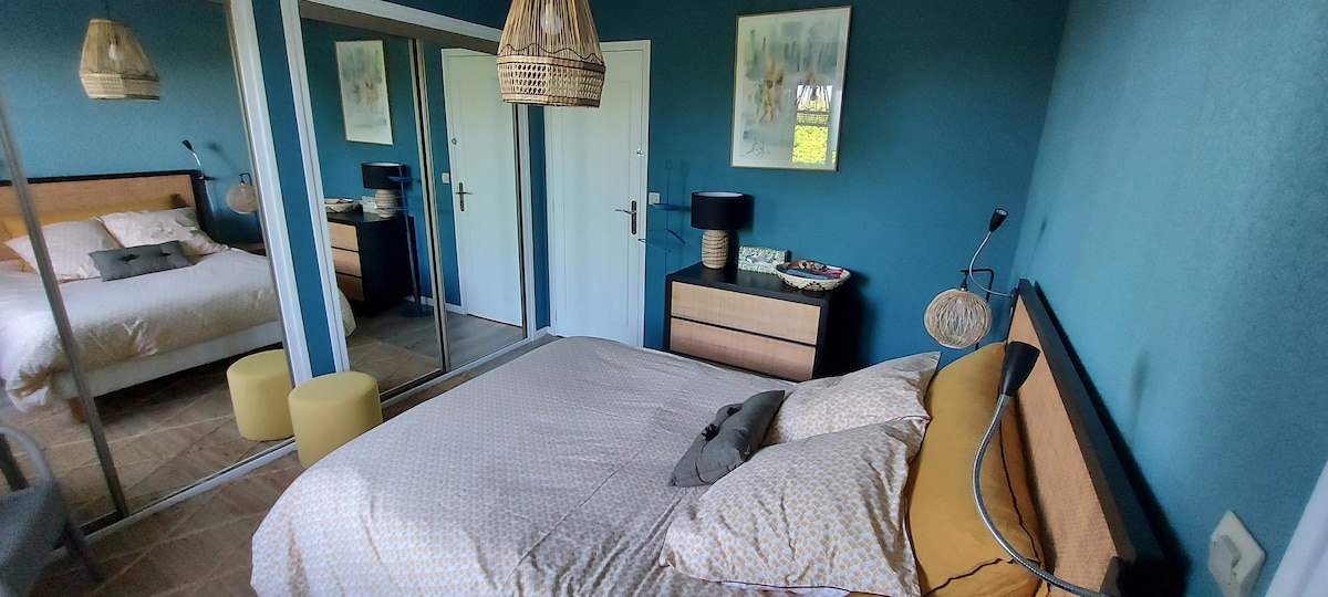 UN PETIT DEJEUNER LIBRE A L'ARRIVEE COMPRIS DANS LE PRIX Logement neuf indépendant avec accés escalier extérieur. Deux pièces (40 m² au sol). Portail et parking indépendants. Entièrement dédié aux voyageurs. Cuisine : plaque induction, réfrigérateur, micro-onde avec grill, cafetière grille-pain et bouilloire. draps 6 personnes, 1 serviette/pers. wifi et ethernet pour télétravail Télévision. Salle de bain-wc douche. Sèche serviettes et sèche-cheveux. Un WC lavabo,frigo ,lave linge en bas
