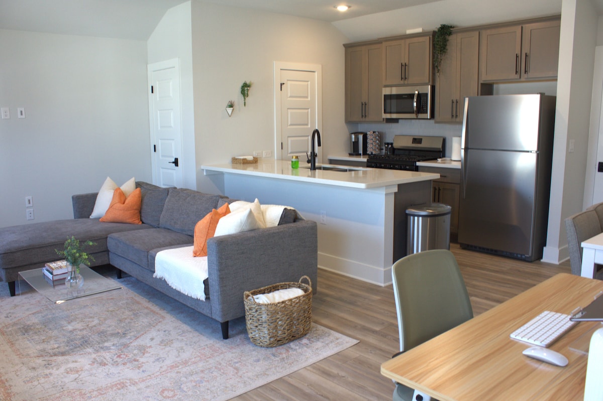 Kick back and relax in this calm, stylish space. This insta-worthy studio has the flexibility for your unique stay! Thoughtfully designed to invoke a relaxing atmosphere while optimizing practicality. Chef at heart? Cook your favorite meal (or heat up your leftovers, we don’t judge) in the brand new kitchen. Got your favorite shirt dirty? The new laundry room has your back! The strong WiFI enables working from home, scrolling through TikTok, or streaming your favorite shows on the smart TV!