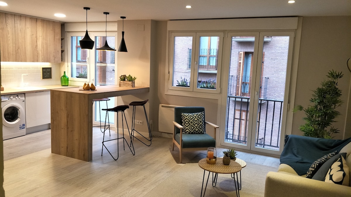 Disfruta de la comodidad de este exclusivo apartamento de 2 habitaciones y 2 baños con terraza soleada 🌞, reformado y totalmente equipado para que te sientas como en casa. Perfectamente situado entre la Catedral y el Ayuntamiento, este apartamento está a un paso de las emblemáticas calles de tapas San Juan y Laurel, bodegas locales, y el parque del río. Todo ello en un entorno tranquilo 🌙, sin el ruido nocturno del centro histórico y lo suficientemente cerca para disfrutar de su encanto.