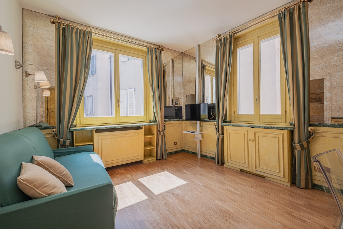The exclusive holiday home "Navona Orso 80" is in Piazza Navona historic centre of Rome. Renovated elegant bright with very large external windows insulated acoustically and thermally on the quiet Via dell'Orso where "wandered" the great painter of 1600, Caravaggio On the 2nd NOBLE FLOOR , 16th century building , renovated with ELEVATOR . Armoured door, oak plank floors, 5 metre high ceilings give a striking appearance to the property. SMART WORK AREA Covid ADVANCED CLEANING NO SMOKING