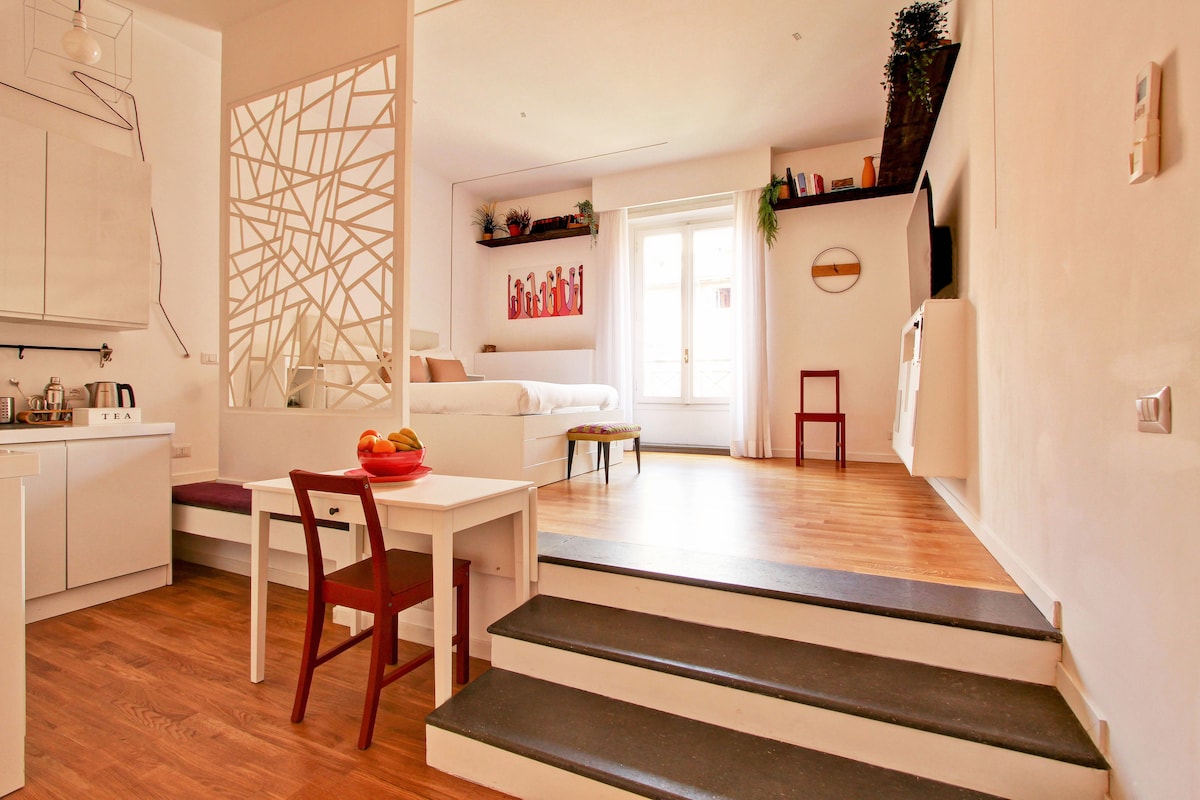 Cozy and quiet independent STUDIO in the heart of the Eternal City, with windows facing the ancient roofs of Rome . The studio has a separate kitchen, and bathroom and the building is located in the middle of the two most lovely squares of the city, with different charm, history, and vibe :Farnese Square & Campo de Fiori. THE STUDIO IS LOCATED IN THE LAST FLOOR OF THE BUILDING - NO LIFT -60 STAIRS . WE DO NOT HAVE A STORAGE AND WE CAN NOT HELP WITH BAGS STORAGE OR EARY CHECK IN .