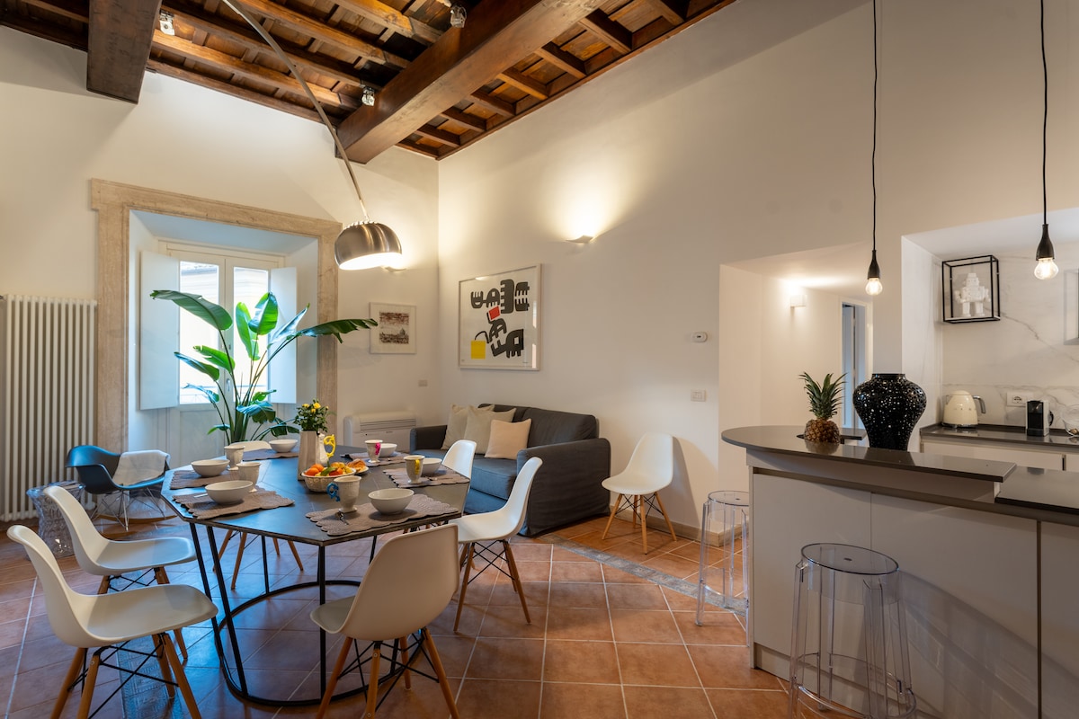 Tucked away on the second floor of an obscure building in a characteristically Roman alley in a section of the historic center that is most noteworthy is this modern and stunning place perfect for those who want to relax as much as those who love design. this apartment is nothing short of a gem. A sunny furnished terrace makes the perfect spot for an unforgettable dinner with friends or coffee to start your day.