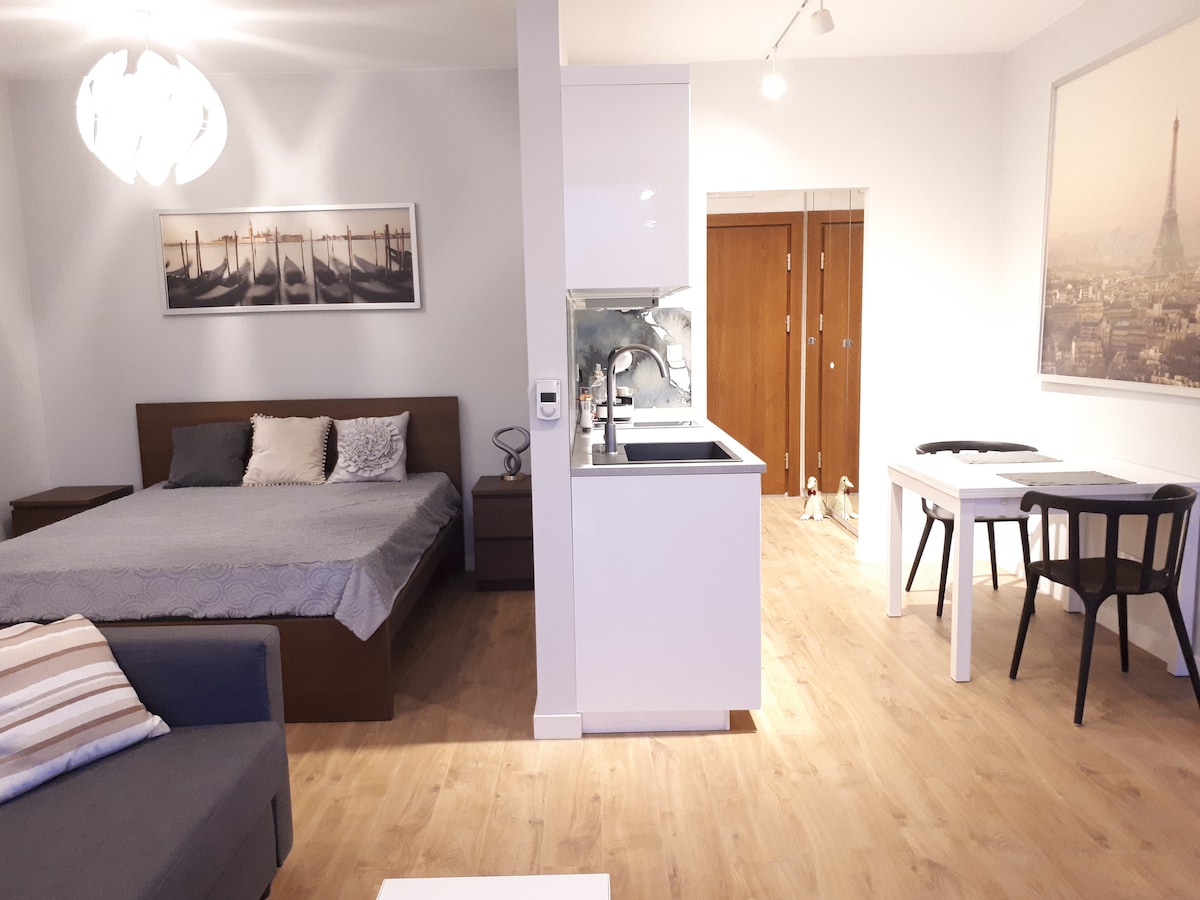 Sydney Apartment is 34 m2 of comfort and functionality. Modern but cozy and functional. There are: a separate bedroom, a living room with TV and a comfortable sofa bed where 2 people can sleep; kitchenette with a dishwasher, a table where you can eat a meal together, or prepare a trip plan or work; bathroom with shower and a large mirror. Additionally for guests: washing machine, iron, ironing board, hair dryer, coffee maker, kettle, radio, coffee, tea.
