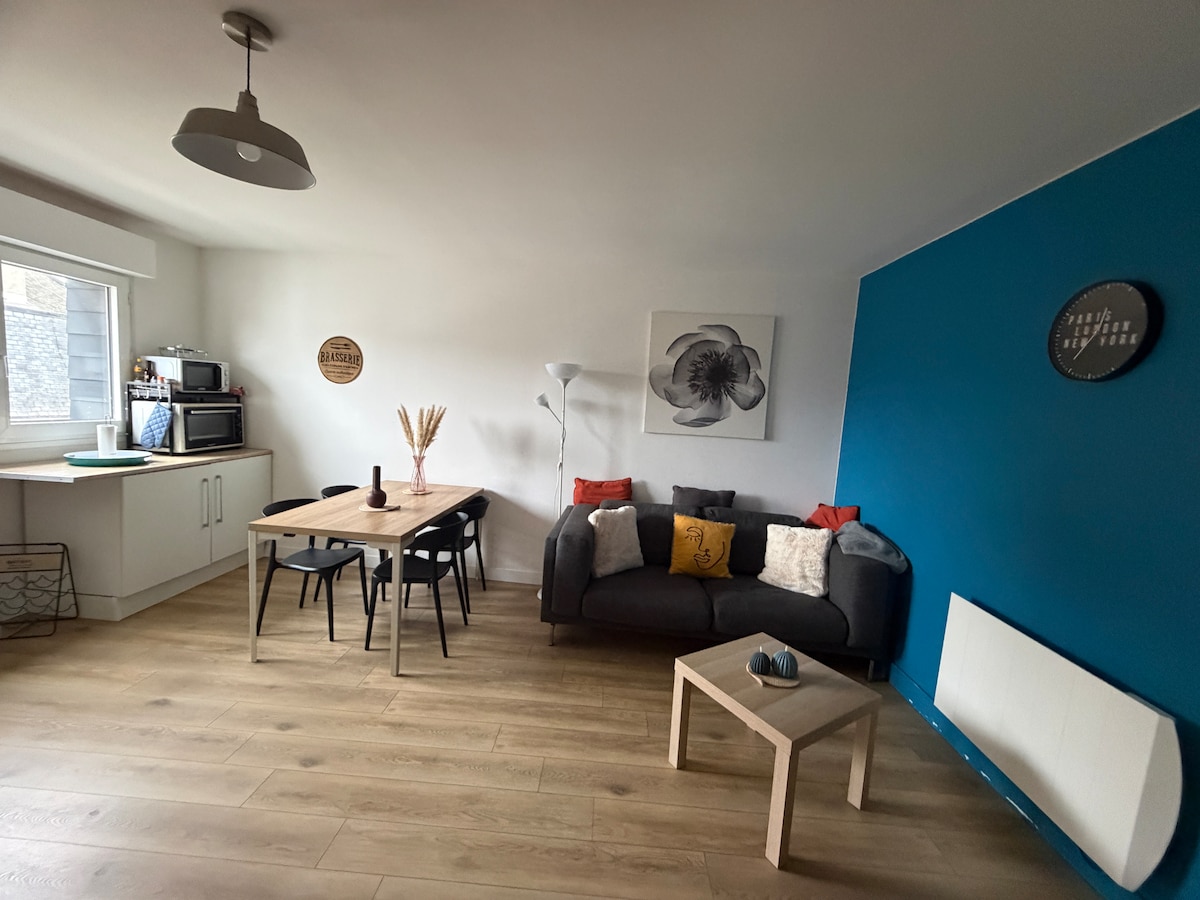 Magnifique logement* HYPER- CENTRE-VILLE* dans une belle résidence sécurisée et calme , à 8 minutes à pieds de la gare, à 90m des **BELLES PLACES** PLACE DE PARKING SÉCURISÉE** pour votre voiture, utilitaire, van, moto et une **BELLE TERRASSE ** donnant une magnifique vue sur le** Beffroi d'Arras**. Canapé convertible pour 2 enfants ou un adulte, ,une chambre , Cuisine, machine à café,Salle de bain avec baignoire, wc indépendant,les clés sont remises par l'hôte..avec plaisir de vous accueillir