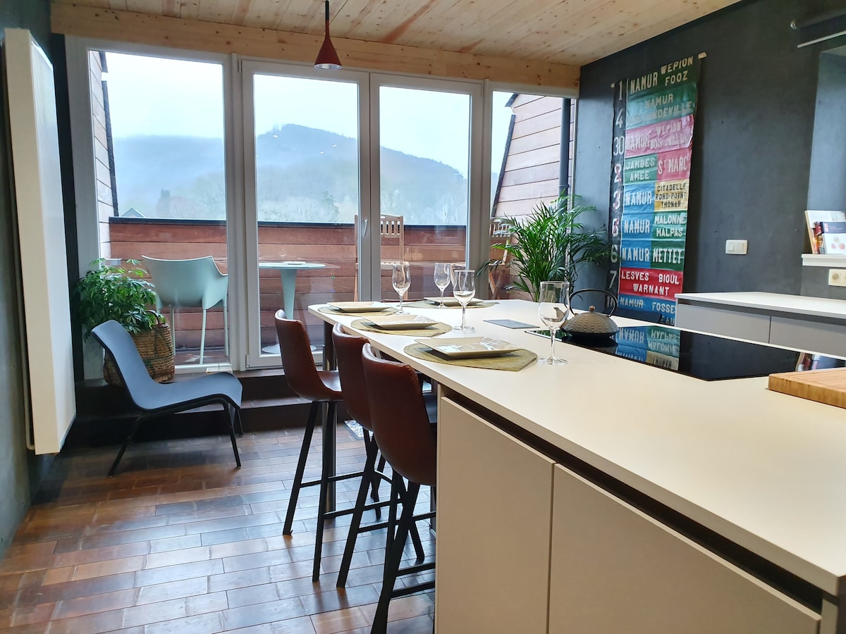 Notre logement de 110 m2 se trouve au 2è étage, terrasse avec vue sur la Meuse. Rénové et tout confort. 2 belles chambres (literie très confortable), cuisine équipée, frigo-congélateur, machine à laver et sèche-linge, TV, entrée autonome avec un code. Endroit stratégique entre Dinant, Namur, Maredsous, les Ardennes. Visites, lecture ou activités nature: vélo, rando, pêche, spéléo, kayak, parapente, etc. Parfait pour du télé- travail. Pique-nique dans notre Jardin en bord de Meuse.