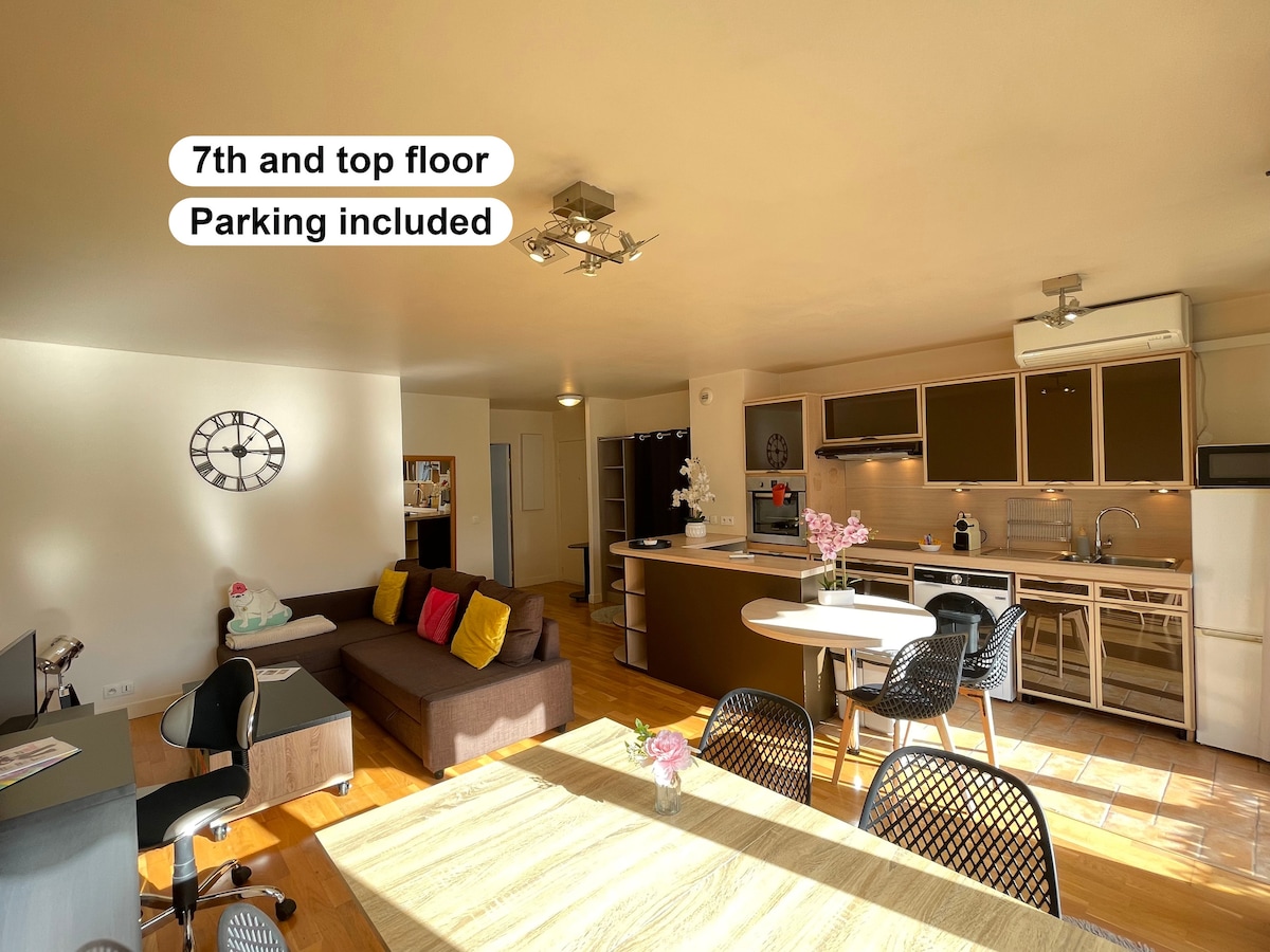 This renovated, fully equipped 67m2 apartment is located in a recent residence near the center of Paris, just 15 minutes by train. The apartment is a 3 min walk from the RER B LAPLACE station, 2 min from the SIEC, 10 min by car from ORLY airport. - 1 living room : tv, sofa bed, table - 1 kitchen : microwave, oven, induction hob, fridge, dishwasher - 1 loggia - 1 bedroom with 1 double bed, tv - 1 bedroom with 2 single beds, desk - 1 bathroom : spa bath, toilet - 1 parking with cameras
