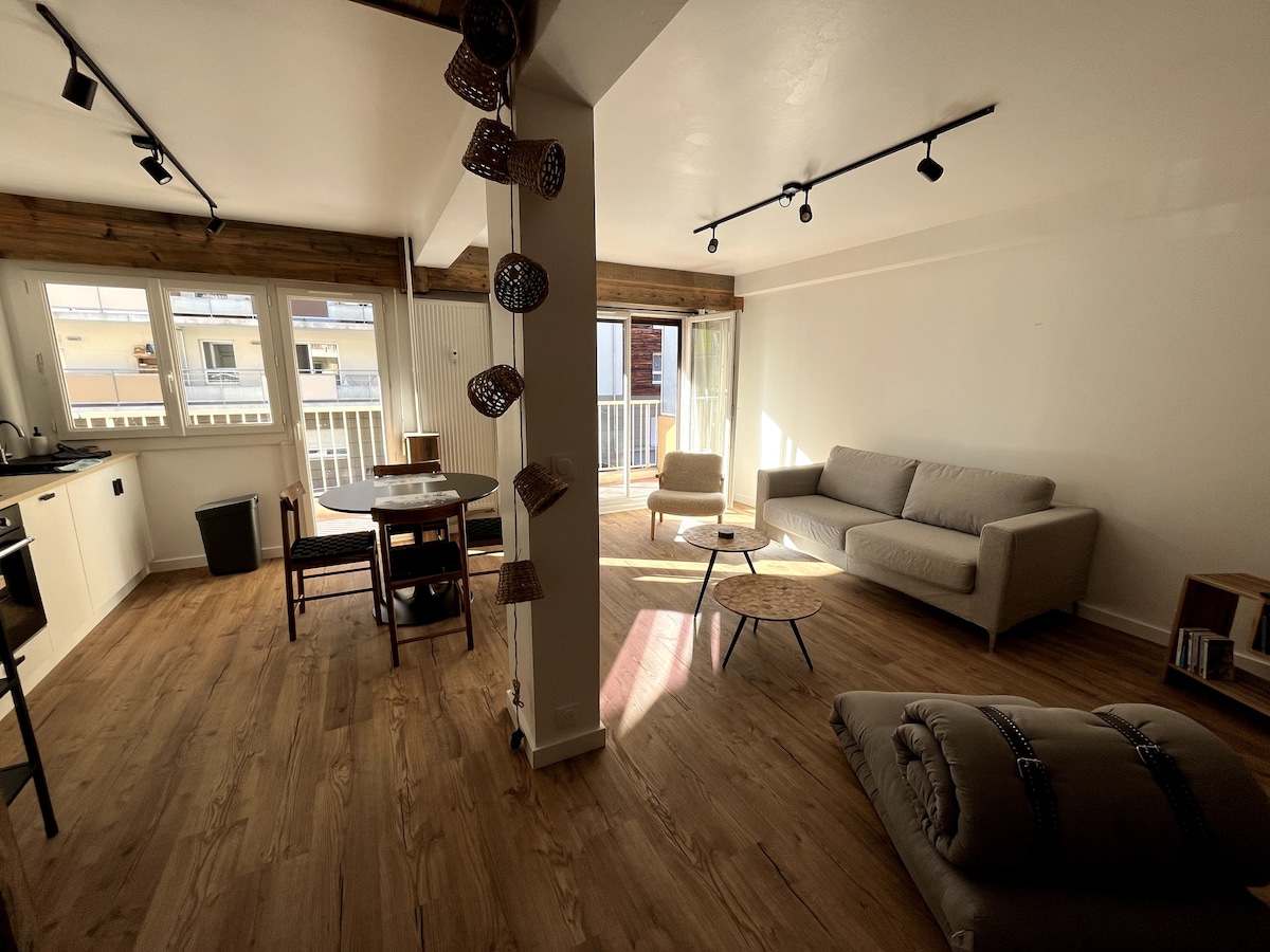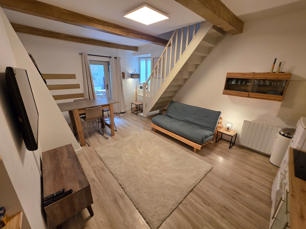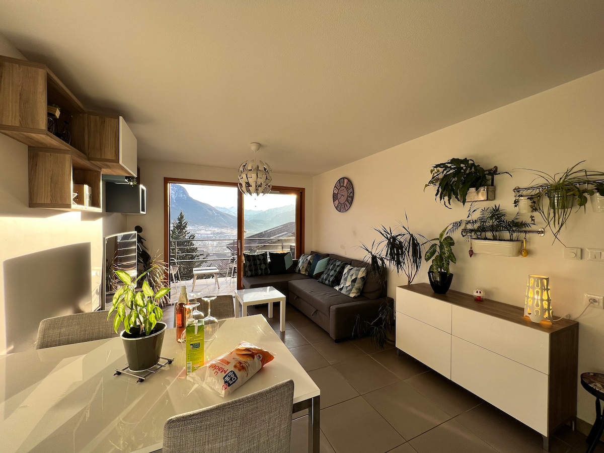 Appartement rénové de 28 m2 au 1er étage de notre maison avec accès par un escalier en colimaçon. Terrasse de 18 m² exposée sud, vue dégagée sur les montagnes. Quartier calme. 1 pièce avec coin cuisine équipé, salon avec tv, wifi, canapé convertible, 1 chambre avec un lit double (140x190cm) et deux lits superposés (90x190cm). 1 salle de bain avec douche et wc. Logement idéal pour 2, possible jusqu’à 4 personnes maximum. Stationnement sur parking privé. A 900 m du centre ville et gare.