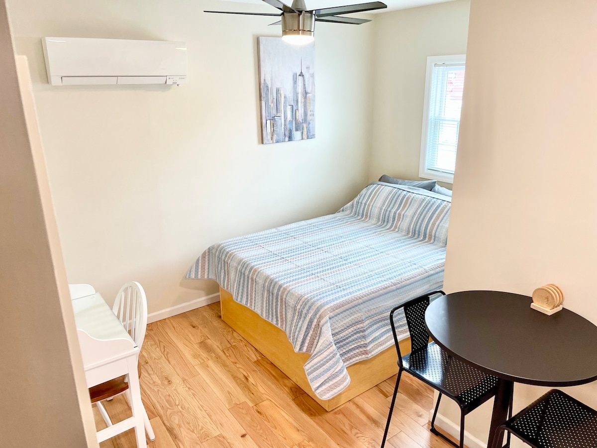 The home and apartment are cozy, clean, and filled with sunny windows. The rented apartment is equipped with a comfortable queen size bed and attached private bathroom and private kitchen includes a full-size refrigerator, microwave, stove, toaster oven and electric hot water kettle. The apartment is on the second floor, with a private entrance. There is one free parking spot. The house is near Queens College.