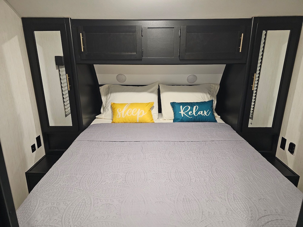 You'll feel like you're in a luxurious 5-star hotel room in this modern, 2-bedroom coach featuring a fully equipped kitchen, a spacious shower, three TVs, and so much more. We provide coffee, tea with all the fixings, and snacks upon your arrival. This coach is stationary but also can be delivered to your pre-reserved and paid campsite at any licensed RV park in Crystal River or the surrounding area. Please let us so we can schedule your arrival or delivery accordingly.