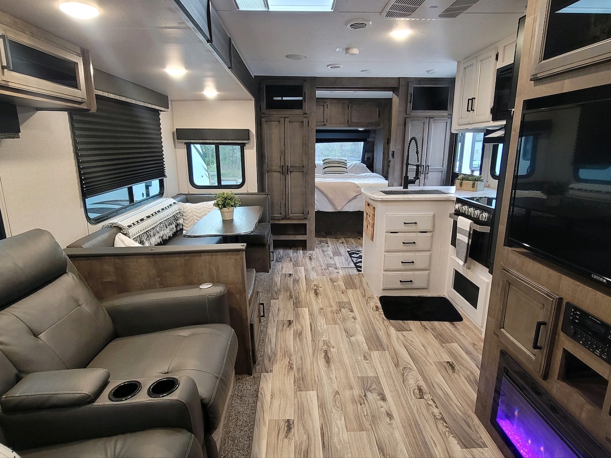 Located near the Homossassa River, you'll enjoy your stay in our brand new 2022 camper. The extra large U-shaped dining table, transfers to additional sleeping for two. Take a seat on the comfy couch and watch TV or take in the calming view of the electric fireplace. In the fridge, you'll find complimentary beverages and a welcome basket full of snacks to enjoy during your stay. End the day with a good nights rest in the upgraded queen bed.