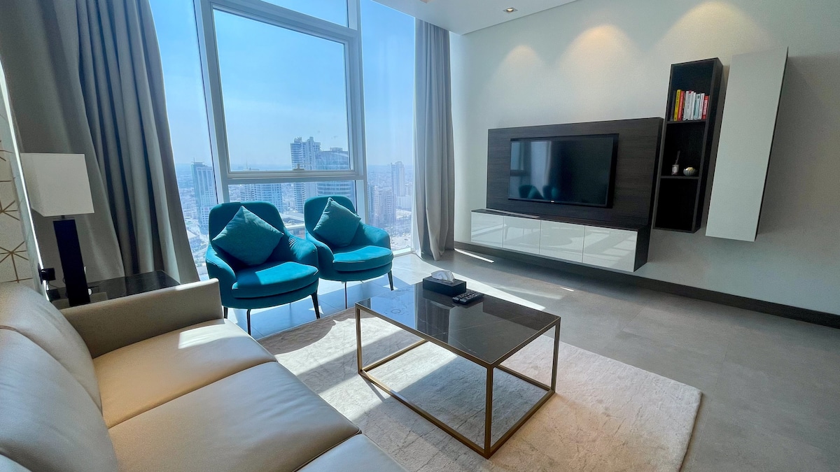 Experience luxury living in this beautifully designed one bedroom flat located high above the city on the 26th floor. Enjoy a spacious living area, a cozy bedroom with plush bedding, and a sleek bathroom designed for relaxation. Car parking available. استمتع بتجربة المعيشة الفاخرة في هذه الشقة المكونة من غرفة نوم واحدة والمصممة بشكل جميل والتي تقع في مكان مرتفع فوق المدينة في الطابق السادس والعشرين. مواقف السيارات متاحة.