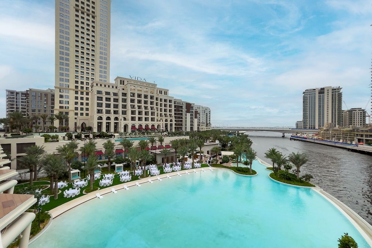24/7 self-check-in! Arrive anytime! Responsive Hosts, Great Location! This is your ultimate Dubai Creek Beach private retreat! A beautifully designed 1 bedroom apartment with sofa that folds out to sleep 2 small children and a bay cot is included too, situated 50 metres from Dubai Creek Lagoon in the heart of Dubai Creek Harbour, and next to Vida Dubai Creek Hotel. Quiet tranquility for business and family-friendly travelers with a private beach and Lagoon. 20 minutes from Downtown Dubai and DXB