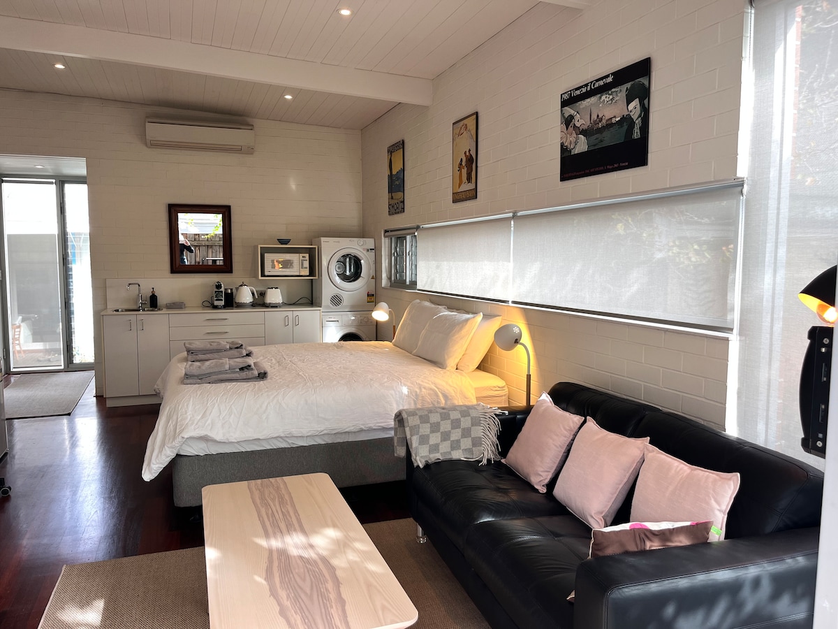 Enjoy all Fremantle and South Fremantle have to offer at this stylish studio. Perfect location in cool neighbourhood. Walk to bars, restaurants and South Beach. Fremantle train and Rottnest ferries are a 15 min stroll or take the bus. Large studio with brand new bathroom. King size bed. Kitchenette with fridge, m/wave, pod coffee. Dining table for two. Balcony overlooking tree-lined street. Private and peaceful. Fully self-contained. Stairway access. Off street parking bay.
