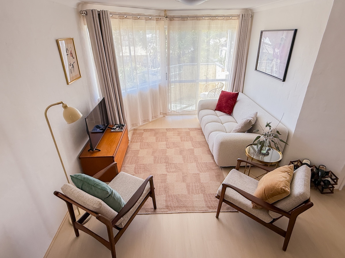 Kick back & relax in this calm, stylish space. Enjoy the coastal lifestyle. Just a short walk to Mosman Beach or stroll to the river. Located in a large 10 storey complex, built in 1969, with 119 units, this 1st floor one bedroom apartment is newly decorated with fresh neutral tones. Open plan kitchen/living/dining, private balcony overlooking leafy parkland, queen bed, well-equipped kitchen & ensuite. Enjoy the shared pool in summer. A short walk to train stations, Cafes, Restaurants & Bars.