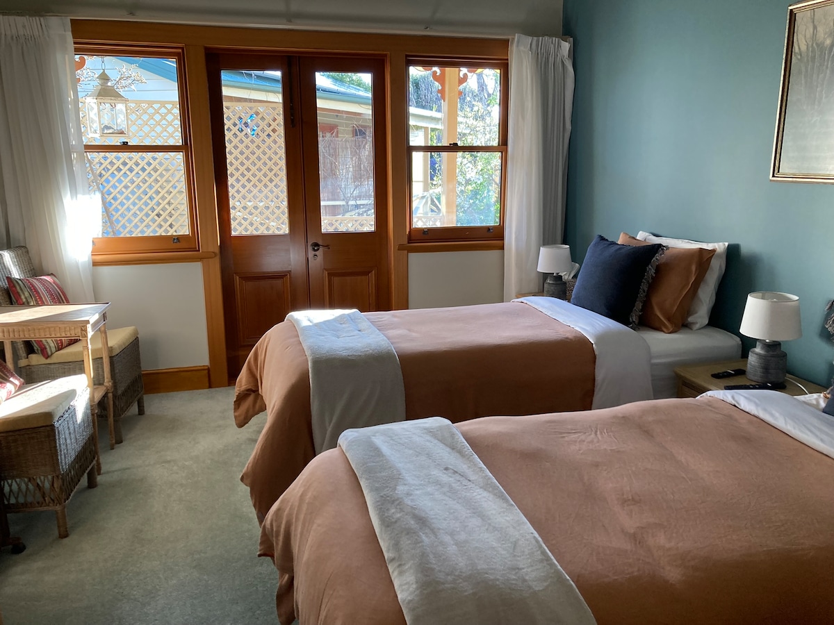 On the bank of the Don River, just 15 minutes from Devonport, the two bedroom unit attached to our home has a private entrance, two queen beds with an extra single bed and/or cot on request. If reserving for 1 or 2 guests, only one bedroom will be accessible unless communicated at the time of booking. The unit has fridge, microwave, coffee machine and dining setting. BBQ in the undercover courtyard for guests. Continental breakfast included. There is no kitchen sink so we do the dishes!