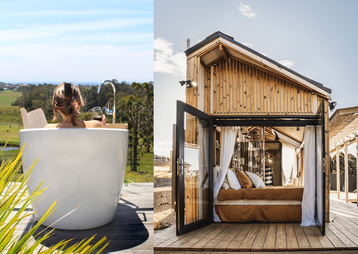 Arc Pavilion is a unique, eco-luxury, romantic escape in the Forth region. Underneath, a 7.5m tiny-house-on-wheels, it was designed and crafted by the Bell Sister's in 2020. With northern glazing to soak up the stunning country-side and Bass Strait views, including an outdoor bathtub, the architecturally-designed accommodation was created as the perfect, unique, eco-tiny house romantic getaway experience; showcasing a unique architectural form/interior design, hand-made furniture and more.