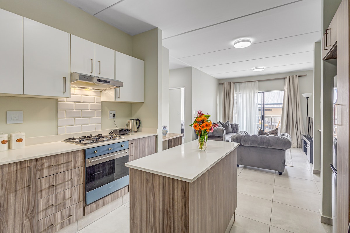 Enjoy a secure and stylish stay in this modern two-bedroom apartment, close to O.R. Tambo Airport. Benefit from 24-hour on-site security guards and convenient 24-hour check-in, ultra-fast Wi-Fi, air conditioning, and UPS-backed power ensuring uninterrupted connectivity and charging during loadshedding. Prepare meals effortlessly with a gas stove and enjoy the comfort of solar-heated showers. Perfect for business travelers and families seeking comfort, security, and peace of mind.