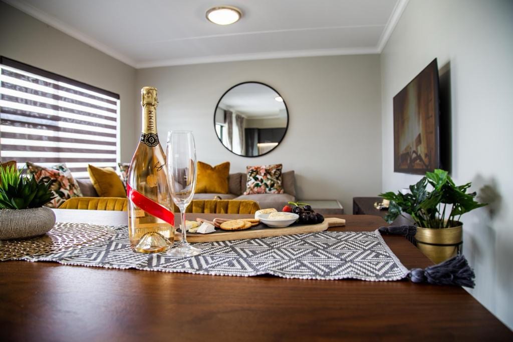 15 Min from OR Tambo. This chic black-and-white space, in a secure gated complex, offers a perfect blend of comfort and convenience. Enjoy a dedicated parking spot, lock-and-go lifestyle, and remote gate access. With a luxurious queen bed and double bed, office space, and high-speed Wi-Fi, it’s ideal for work or relaxation. The fully equipped kitchen includes a gas hob and dishwasher. Relax on the cozy balcony and enjoy premium furniture, bedding, and dining essentials.