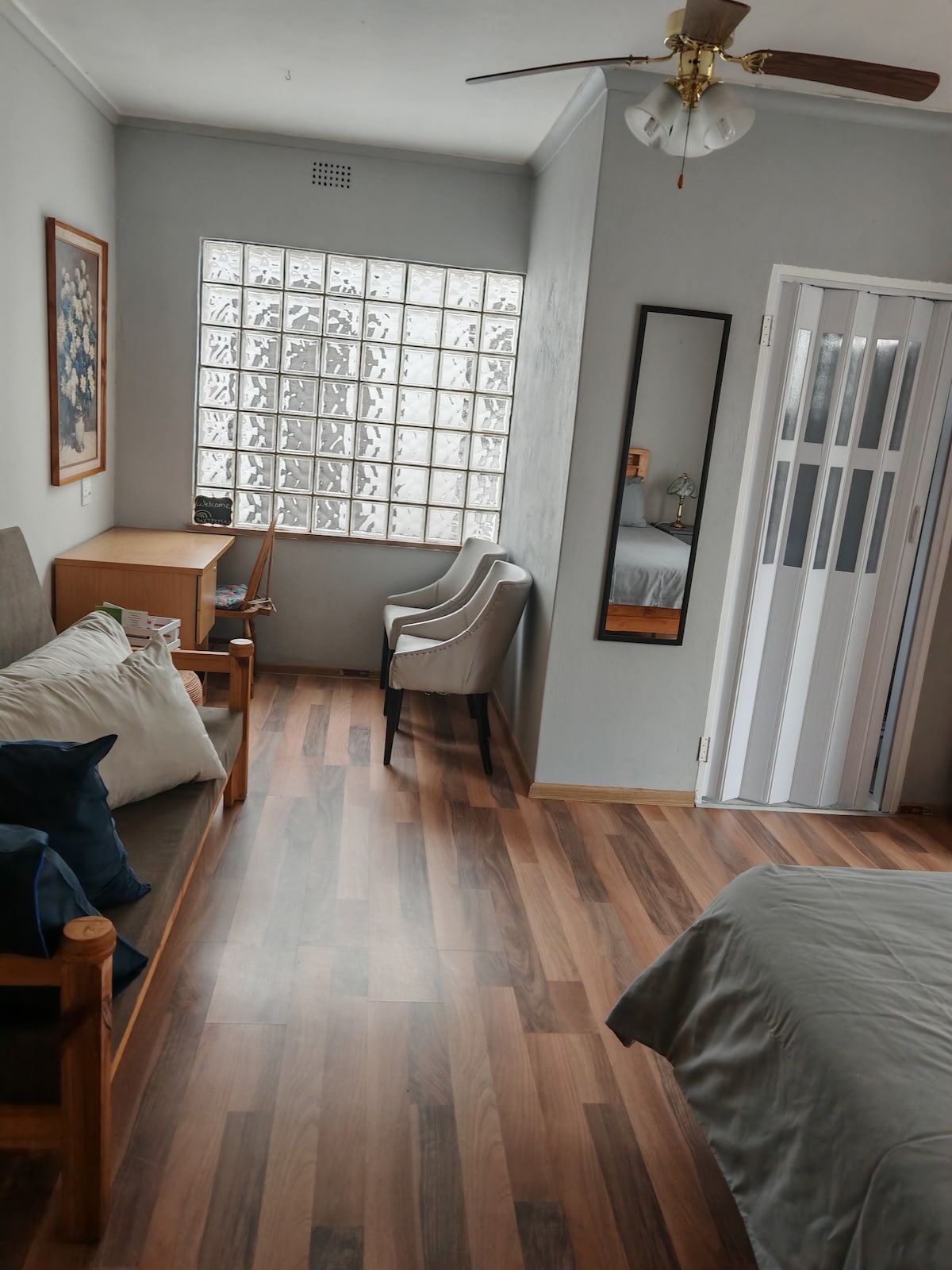 A very comfortable guest suite located in Brackendowns Alberton, ideal for a couple or single person. With its own private entrance and secure under cover parking. We have solar installed, so we are not affected by load shedding. A tea, coffee station and mini fridge is provided in the guest suite. TV with Netflix. Plenty of cupboard space. The en suite bathroom has a shower, basin and toilet. Please note that this is not a self catering establishment, there is no cooking facilities.