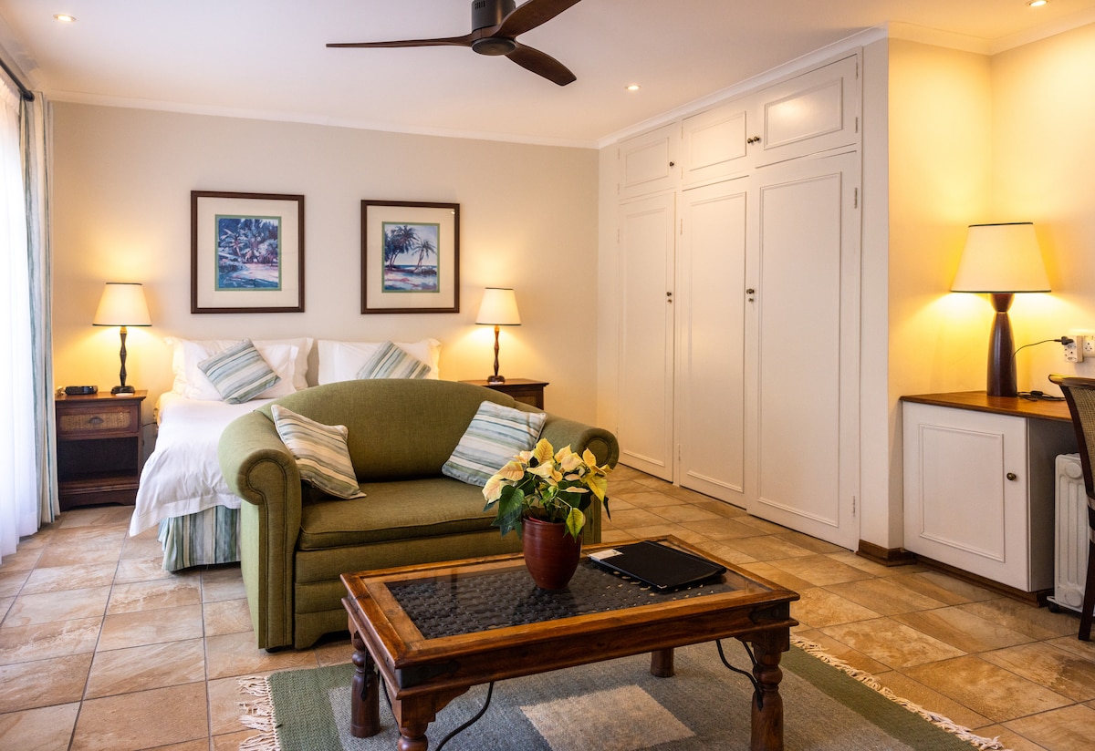Charming farm house decor in whites and greens. Revamped modern bathroom with shower. Queen size bed plus three quarter bed for extra guest/children. Private garden patio area with table and chairs. Breakfast on request from 7 to 9am. Fiber wifi. Small well trained dogs with their own beds welcome. There is ample parking, security and a swimming pool available. The room is serviced weekly or at your convenience.