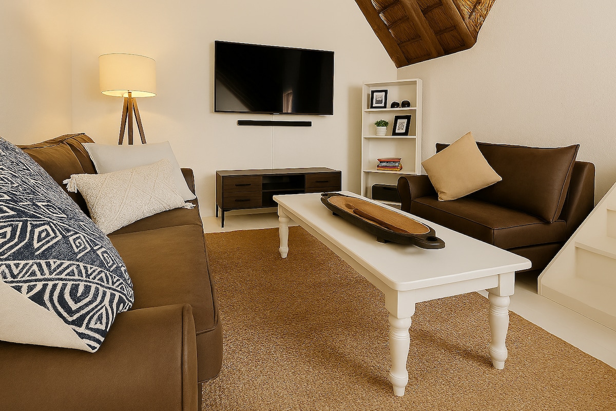 Safe, Stylish & Spacious Near Sandton. Unwind in this beautifully styled, extra-large studio apartment set in the secure Thornhill Estate conveniently close to Sandton and OR Tambo Airport. With a generous open-plan layout with a full kitchen, luxury finishes a spa-like bathroom with dual basins, a walk-in shower and an oversized bathtub. Dedicated workspace and fast Wi-Fi. Access to estate amenities including a shared pool. Perfect for work trips, solo travellers or couples.