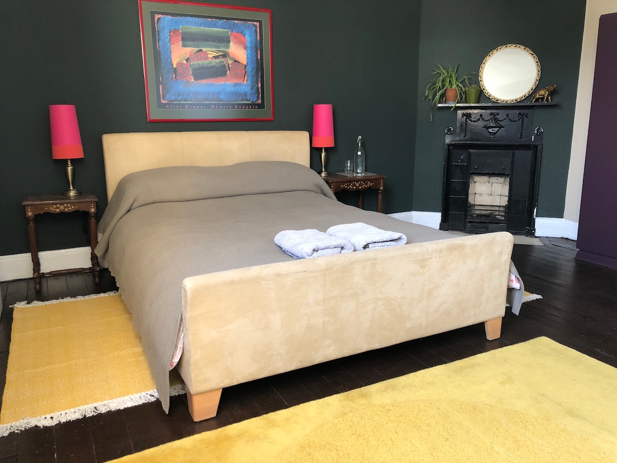 This quiet, spacious and comfortable room has a soft and supportive king-sized bed, made up with fresh, soft linens, a big wardrobe and a professional workspace. You will have access to the shared spaces in the rest of the house, including two bathrooms (both with showers, one with a bath), a well equipped kitchen, cosy living room with wood burner, bar area, gym and garden- shared with myself and usually other guest/ guests. Towels, toiletries, tea and coffee, will be provided.