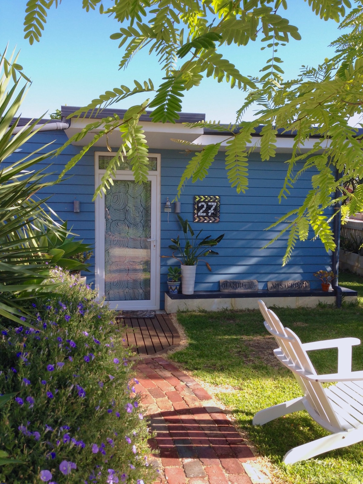 A newly-built sanctuary, ten minutes from Fremantle and South Beach, self-contained in lush gardens. A spacious open plan, with living, kitchen and bedroom in one space with separate bathroom. French doors to your own courtyard. Furnished with vintage and upcycled materials, this character studio is on a bus route to Perth/Fremantle. Sleep-in lovers note - best suited to "morning types" as not all windows have blinds. No smoking/vaping inside/outside. Shared outdoor washing machine.
