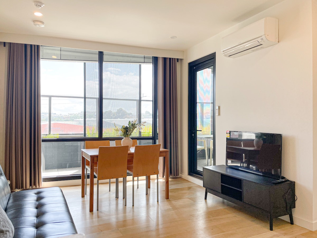 An exquisite apartment located in Clayton near Monash University features open-planned living and dining spaces. • Secured Entrance. • 2 Bedrooms. • 2 Comfortable 5-Star Queen Beds and Bed Linens. • 2 Bathrooms. • Private Balcony. • Air-conditioners in Living area & Main Bedroom. • 1 free parking space in Secured Basement. • Free Wi-Fi. • Fully Equipped Kitchen. • Netflix, Disney+ and Amazon Prime available on 43" Smart TV. • Quiet neighbourhood